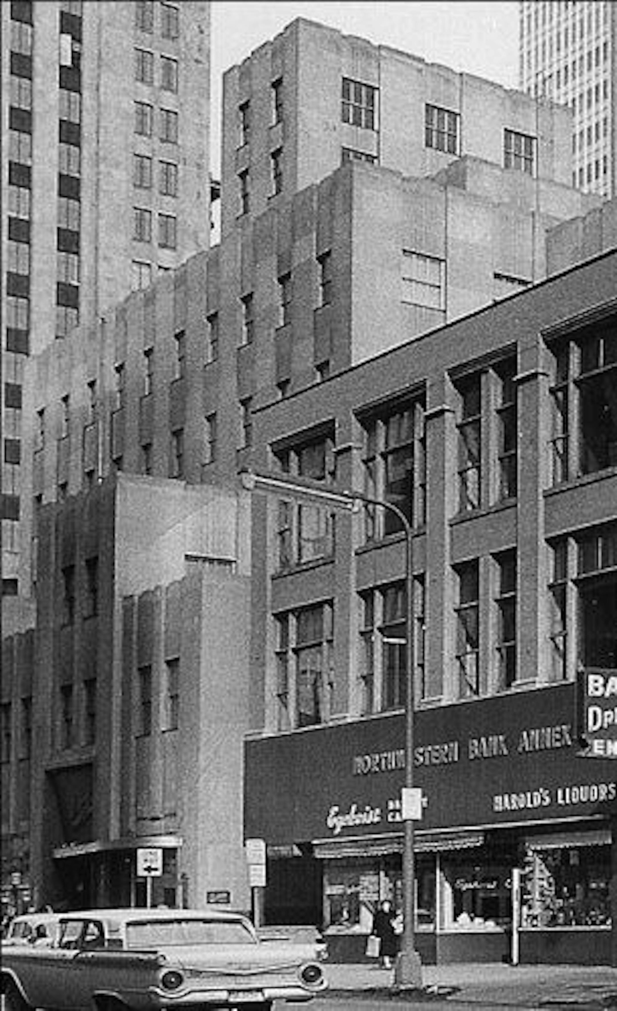 If it wasn't for the Rand Tower on the left, you might have trouble placing the block. The building on the right is undistinguished, without any style or decoration. The original purpose of the building in the middle is a mystery -- it has a broad garage door, suggesting that it was a warehouse -- but such a structure seems odd for the core of downtown.