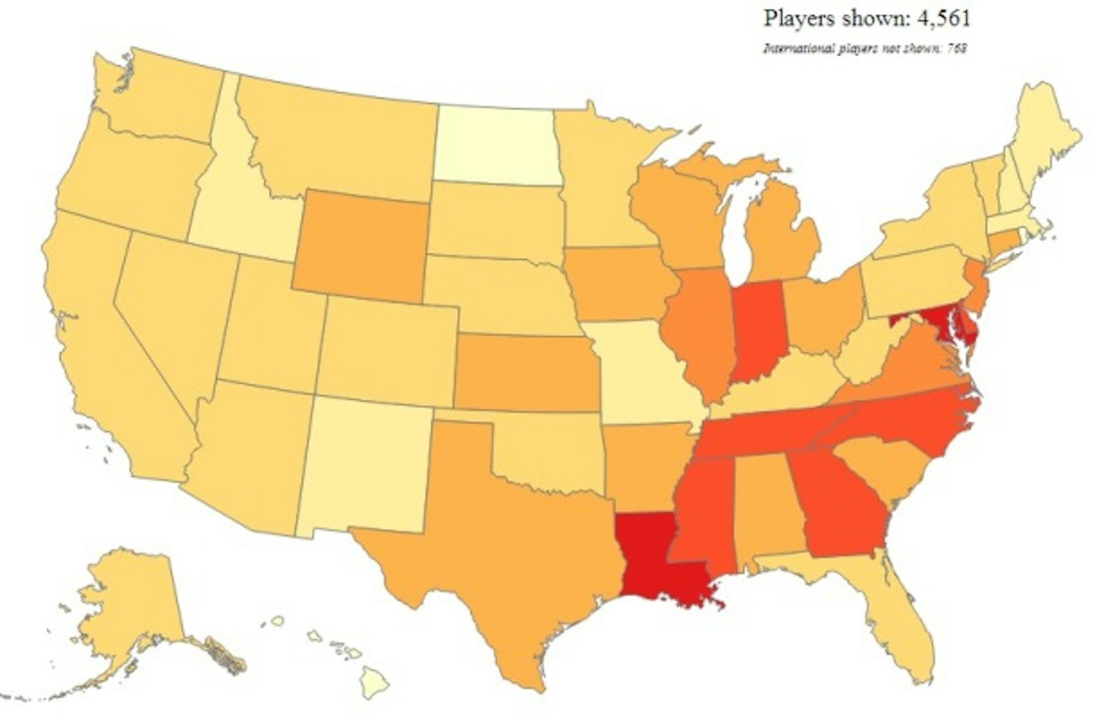 Do you like maps? Sure you do. Do you like information? Heck yeah! Then you will really like this interactive map at Mode Analytics that breaks down where Division I men's college basketball players come from, by state. The relative quantity is shown by the coloring in the image above, but the real stuff you want is on this link, where the map becomes interactive.