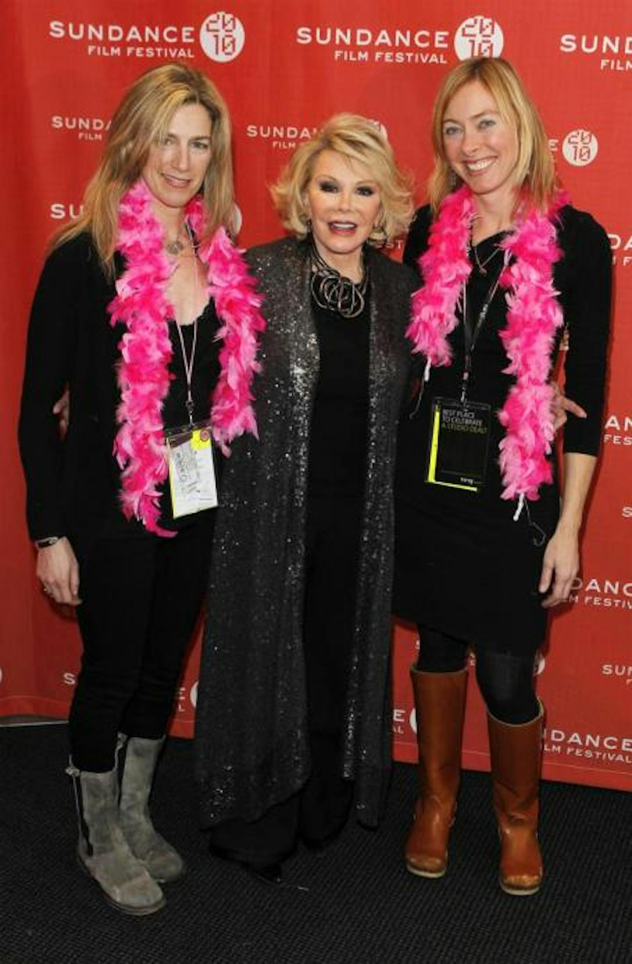 Who are you wearing? Ricki Stern, Joan Rivers and Annie Sundberg do the black carpet at Sundance. AP photo. Park City, Utah By Colin Covert No joke: Joan Rivers keeps unusual mementos when someone she loves passes on. At the Sundance Film Festival for the premiere of the cinema verite documentary "Joan Rivers: A Piece of Work," the comedian said she asks for ashes from their cremated remains and keeps them in "little Louis Vuitton cases." Her collection includes remains from her late husband Edgar Rosenberg, her pets, and her friend actor Vincent Price. "When I'm cremated – and I hope I'm dead – I'd like them sprinkled in with me, absolutely" she said Tuesday. The new film, an account of a year in her life comes from New Yorker Ricki Stern and Edina native Annie Sundberg. It's the duo's third film at Sundance, following their 2006 debut feature "The Trials of Darryl Hunt," the story of a man wrongfully convicted of rape and murder, and their Darfur documentary "The Devil Came on Horseback." They gained access to Rivers through Stern's mother, a longtime friend, but the film pulls no punches. It's an unfiltered look at an irrepressible, profane, politically incorrect personality. The first scene is an extreme close up examination of Rivers' surgically rearranged face. At one point she asks if she can call the chic Michelle Obama "Blackie O," and she later engages in an onstage shouting match with a heckler who says a joke about Helen Keller isn't funny. She jokes about her daughter Melissa, dropping the C-bomb. Yet the movie shows her vulnerable side as well. It plays like a gene-splice of the Anna Wintour biopic "The September Issue" and "Tyson," showing us what's behind the mask of a misunderstood icon. At 75, Rivers jokes that the documentary team followed her in hopes of filming her drop dead onstage, but she remains a tornado of ambition and energy. The film shows her booking cruise ship engagements, performing in auditoriums and dumpy comedy clubs, subjecting herself to a Comedy Central roast, selling her jewelry line on QVC, doing book signings, and staging an autobiographical one-woman show in Edinburgh and London. She even turns Thanksgiving into a marathon of meals-on-wheels charity catering followed by a grand dinner in her palatial apartment, which she describes as the kind of place Marie Antoinette would live "if she had the money." The source of her energy, she said, isn't discipline but "desperation." "I always go the extra mile. I try harder because I never thought I was the brightest one in class so I worked a little bit harder. I still do it. I'm Tweeting today from Sundance. I have prepared all these stupid little jokes. I've been doing it for a month and a half. That's just the way I work. Nothing's changed" since she was a struggling comedienne in the early 1960s kicking the doors open for other female comics. Rivers was the permanent guest host for Johnny Carson on "The Tonight Show" until she left NBC to host an ill-fated Fox talk show. She was snubbed by Carson from that day until he died and blackballed by the network ever since, and she takes some pleasure in watching the collapse of NBC's late night schedule. "They shoulda hired me. My ratings were always better," she said, adding sarcastically, "not that I'm bitter." Rivers stirred up controversy as the first comedienne to make jokes on TV alluding to abortion, and she said she still considers nothing off limits. "Every Wednesday night I work at this little club in New York, the West Bank. I've been doing Haiti jokes. You've got to laugh at it, it's so bad. Their major import was AIDS. You've got to laugh. We're still gonna work hard" for disaster relief, "but you gotta bring it into where we can deal with it." "I just go out there and say what I think is funny. Thank God I was born in New York, where they laugh. If I was born in Salt Lake City…it's lovely but you know what I mean. It would have taken a little longer." The film shows Rivers at vulnerable moments. As she reads unfavorable notices of her London play, she's clearly hurt. But allowing that kind of access was a given once she agreed to let camera crews into her life, she said. "If you're doing a documentary it should be a documentary. If you want to see people ass-kissing you, go watch 'Biography.'" Ever in motion, Rivers and her daughter Melissa will soon be back on TV in a reality show titled "Mother Knows Best," she announced. "I'll be moving into her house while I look for an apartment in L.A. and she's already hysterical." She'll be back on the Oscars red carpet and she's working on another book. "A million balloons, and let one stay up," she prayed.