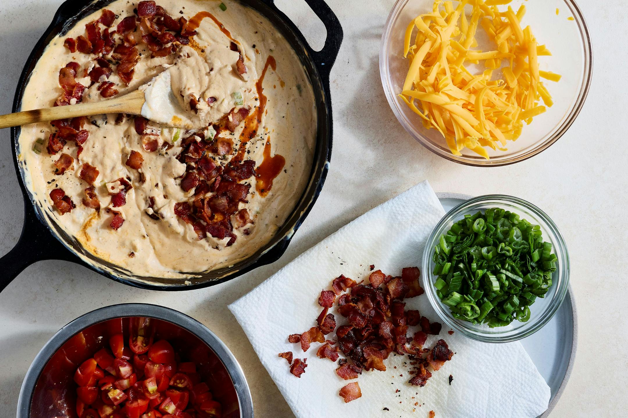 For this dip, I chose the classic, crowd-pleasing pairing of bacon and cheddar, zipped up with dashes of hot sauce. I also added scallions two ways. The white parts are sautéed in the leftover bacon fat, making them soft and sweet. Then, the greens are sprinkled on top for their crisp bite and bright hue. Teamwork!