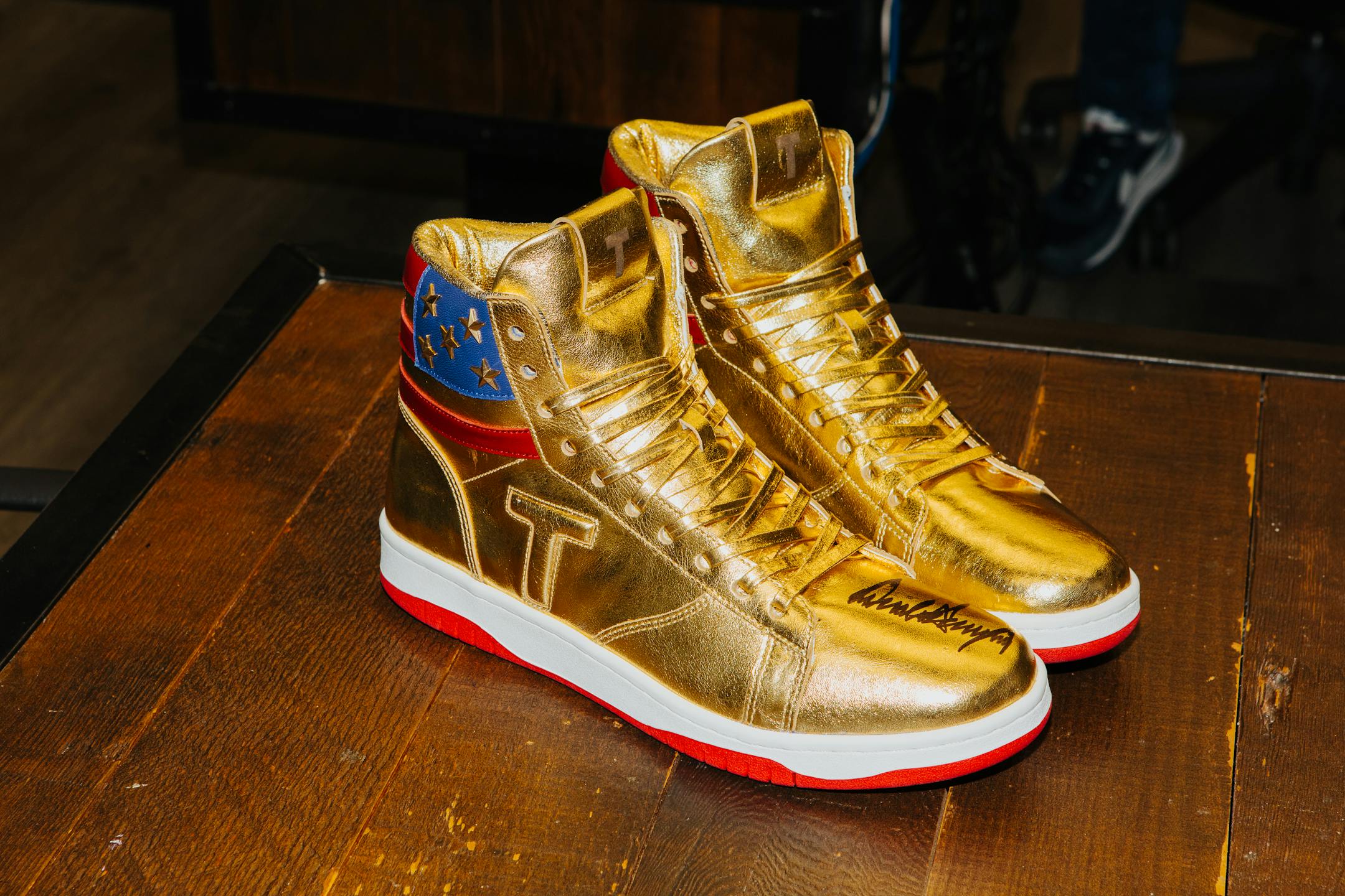 Above each ankle was an American flag of sorts, consisting of red and black lines and a blue box filled with spangly stars and stripes. There were Ts embossed on the tongue and Ts on the sides. The former president’s signature appeared in thick black ink on the shiny right toe box.
