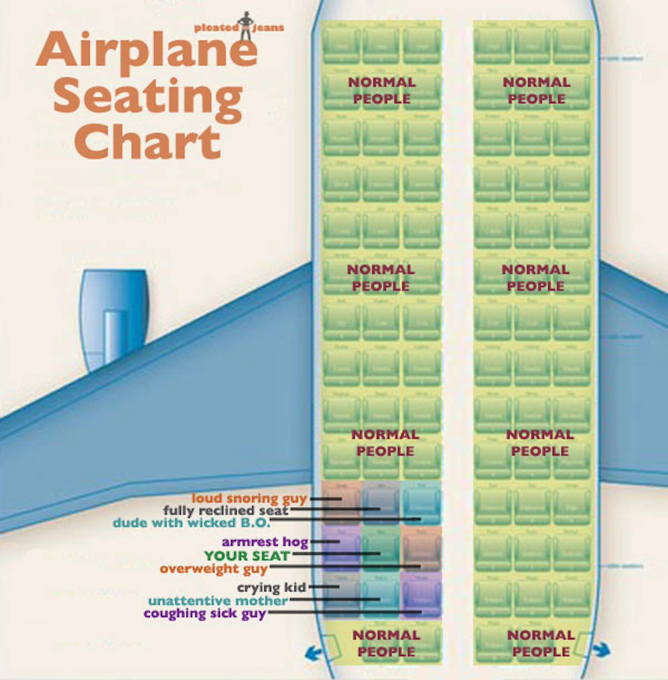Hats off to Jeff Wysaski, the creator of the chart you see below and a frequent flier in coach class (I didn't talk to the man; I'm just guessing). Scroll down to the bottom to see the wisecracking wisdom. Wysaski's funny illustrations appear on his website, pleated-jeans.com, and I highly recommend a visit.