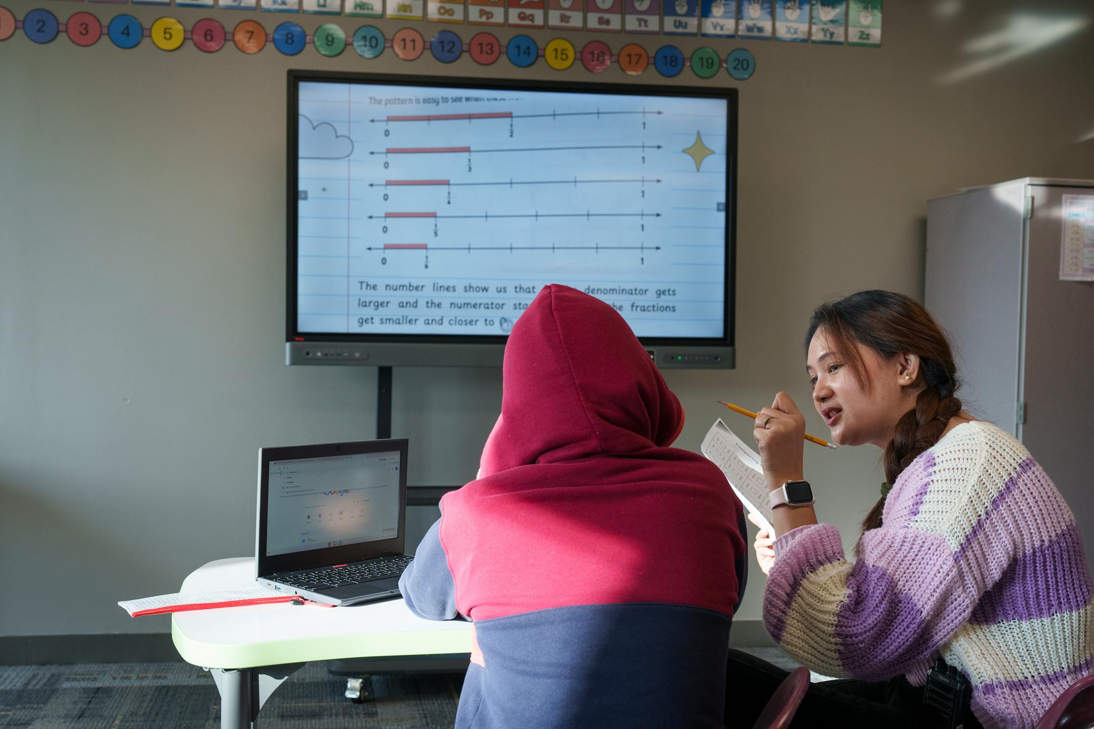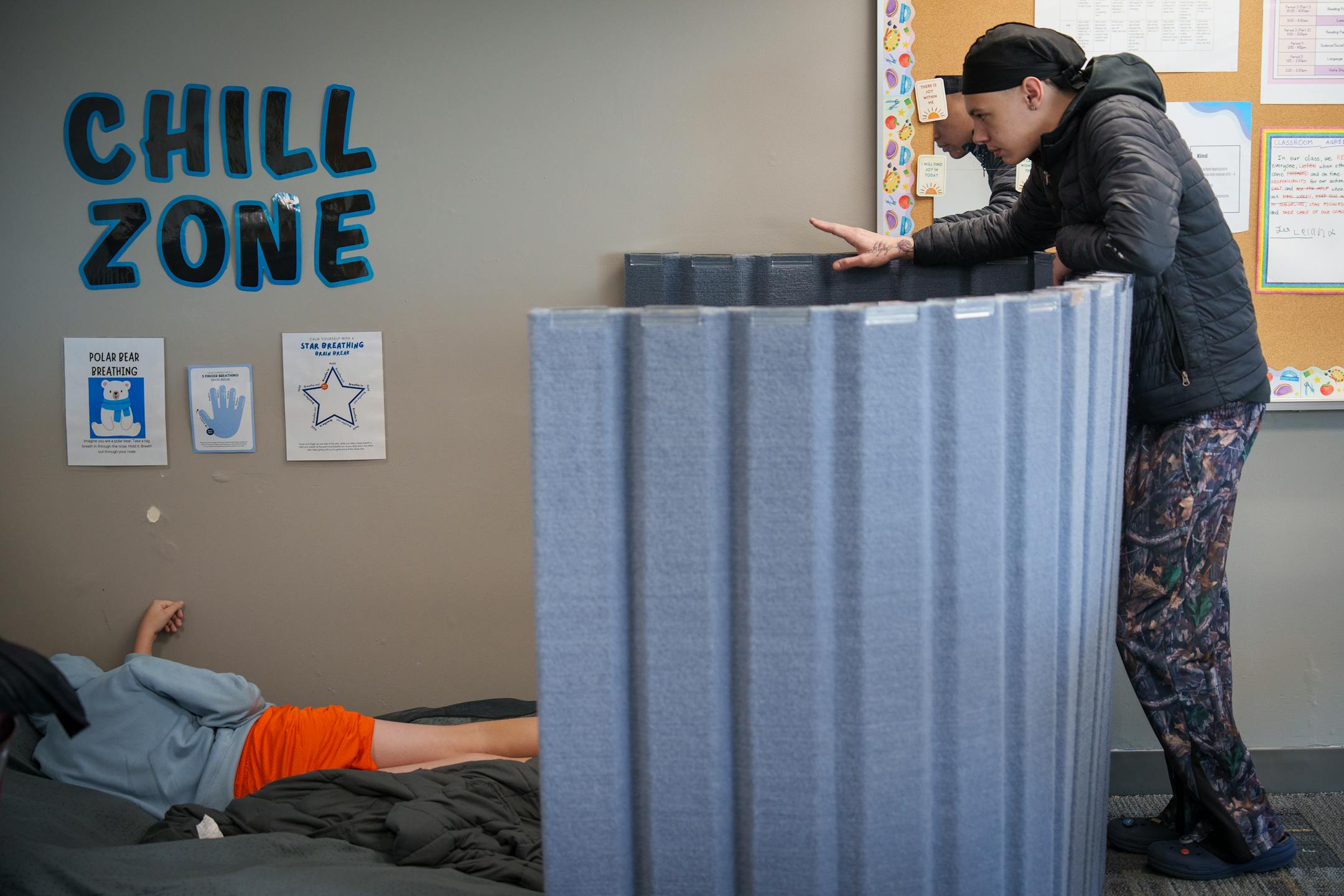 Classrooms are intentionally flexible, with whiteboard tables, sensory tools and individualized workstations that, for at least one student, look like a stack of bean bags in a cozy corner.