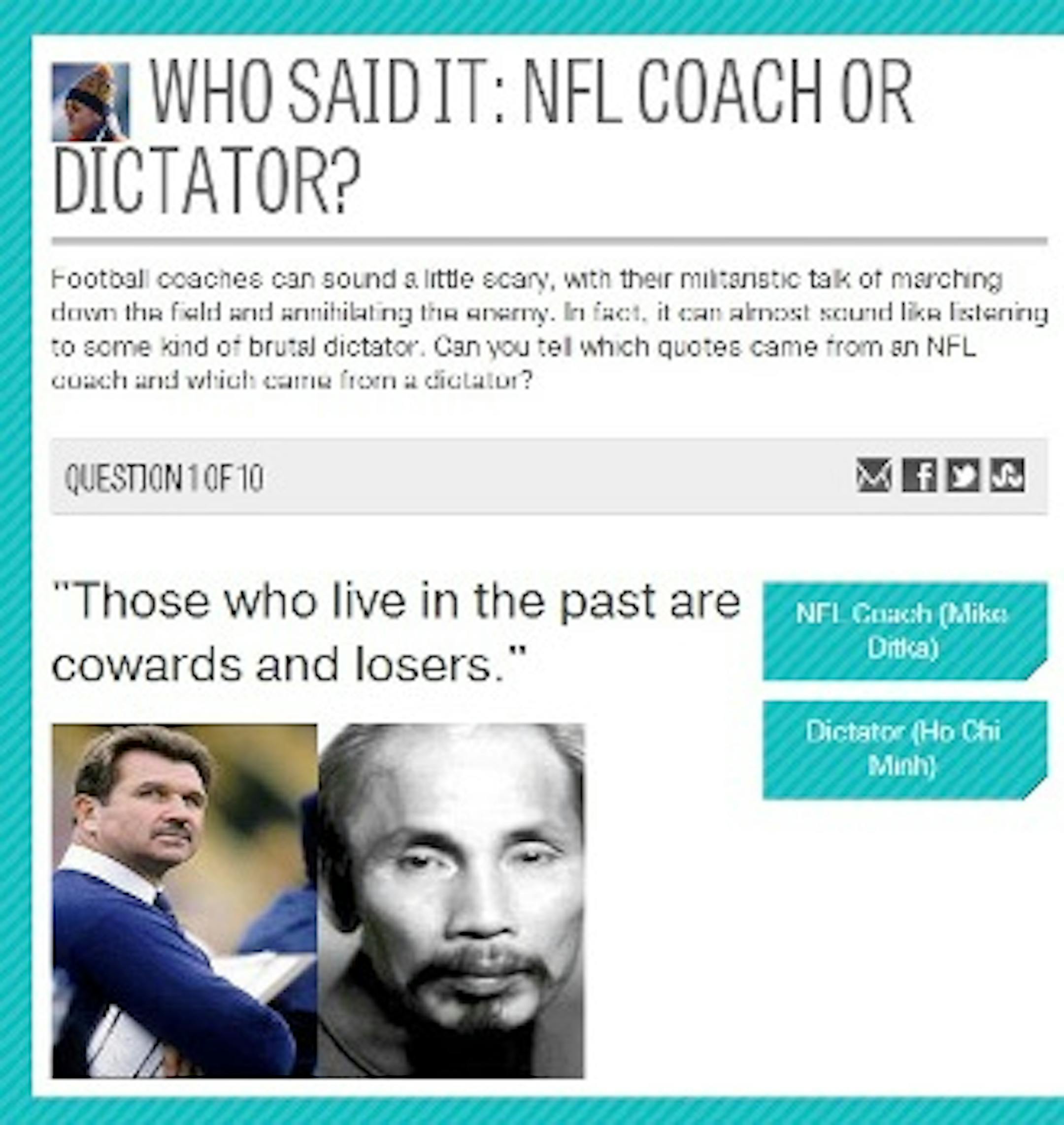 NFL head coaches are driven. Sometimes too driven. They make all sorts of analogies. They talk about life, death and war. In short, they tend to sound like ruthless dictators. As such, you have the opportunity to take this tremendous Mental Floss quiz.