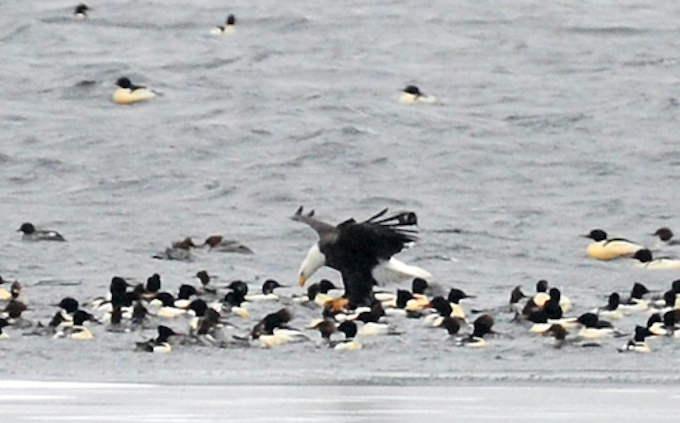 Several thousand Common Mergansers were gathered on Lake Minnetonka mid-day Monday, on water soon to freeze. The birds are east of the Arcola bridge on County Road 15, about two miles west out of Wayzata. Bald Eagles were there as well. Me, too. With camera in hand I waited for an eagle to take a merganser, as eagles had been taking coots the day before on Wayzata Bay. Why else would eagles swing back and forth over the merganser flock, occasionally swooping low with talons extended? To fish, that's why. I saw two of the eight eagles I watched come away with fish in their talons. I watched as the birds with fish were harassed by other eagles, birds hoping a fish would fall their way. Two Canada geese were present along with five Trumpeter Swans. I saw no coots or other waterfowl species. The coots the day before had made as much effort as they could to avoid the eagles. (See earlier postings.) The mergansers had no obvious reaction to the eagles, no matter how close.