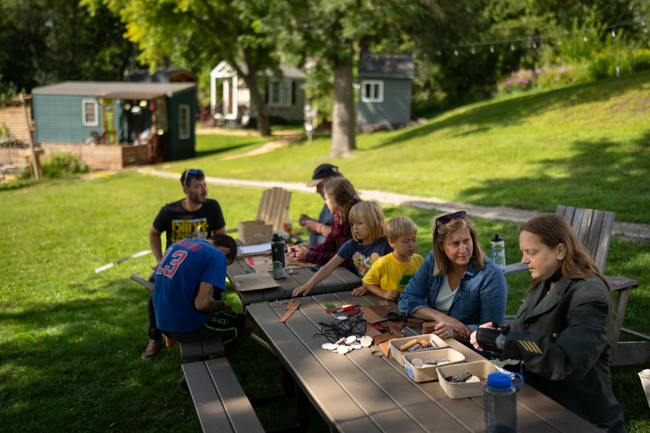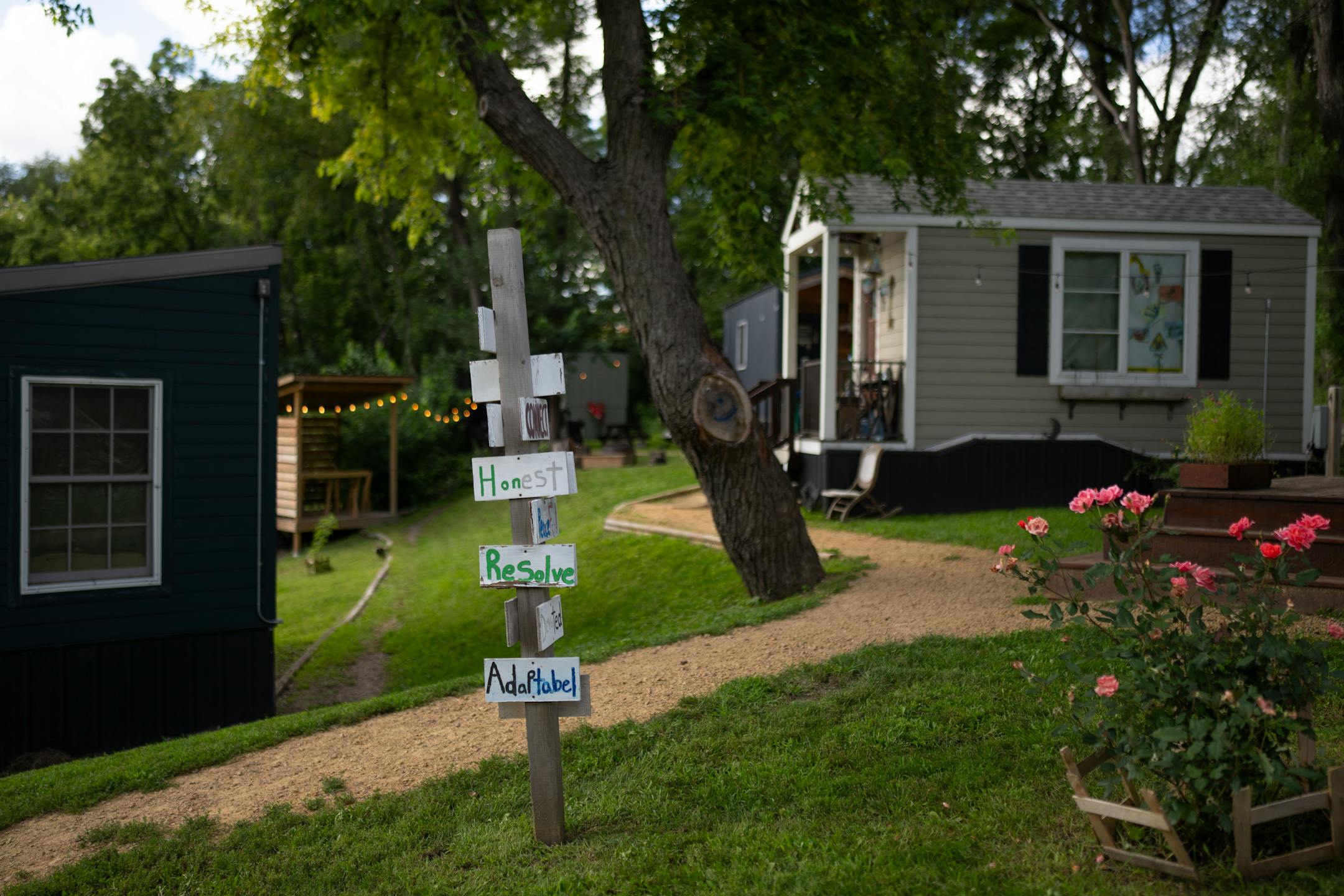 The settlements are modest, each comprising a handful of tiny houses clustered near trees and water. Neat, wood-chipped trails ramble from one home to the next. Hand-carved road signs and communal vegetable patches add a cottage flair. Each house is uniquely built and donated by other churches across the state, with rents based on size.