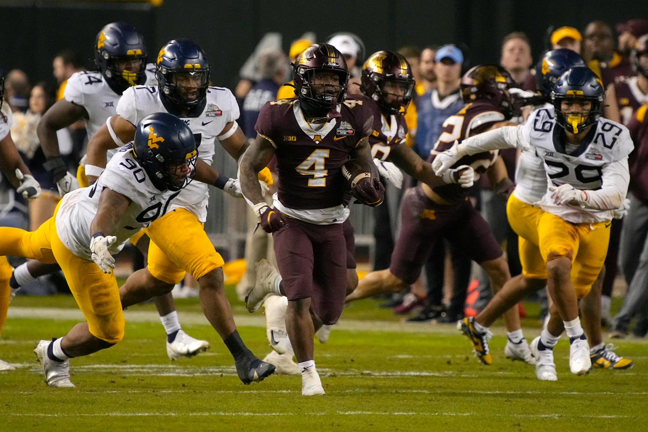The recap: The Gophers rode a stifling defense and second-quarter touchdown runs by massive offensive tackle Daniel Faalele and running back Ky Thomas to defeat West Virginia in the Guaranteed Rate Bowl on Tuesday night at Chase Field in Phoenix. Thomas rushed 21 times for 144 yards, and Mar'Keise Irving carried 19 times for 129 yards as the Gophers (9-4) beat the Mountaineers (6-7) for their fifth consecutive bowl win and third in a row under coach P.J. Fleck. Only Alabama's active streak of six straight bowl wins is longer.