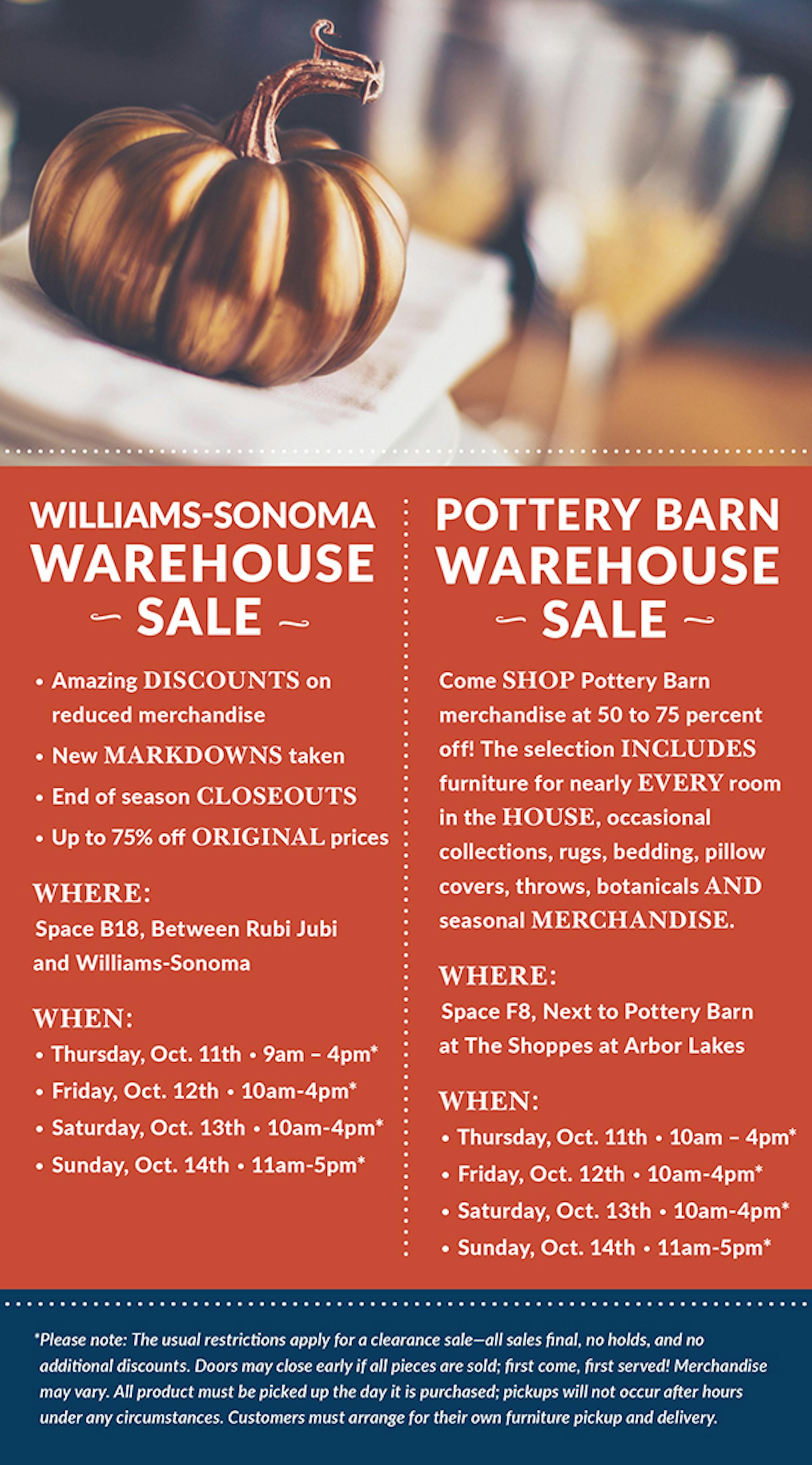 Pottery Barn will have its warehouse sale Oct. 11-14. All merchandise will be 50 to 75 percent off, including furniture, rugs, bedding, pillow covers, botanicals and seasonal merchandise. All items, including furniture, must be picked up on day of purchase. The sale is in a space next to Pottery Barn at Shoppes at Arbor Lakes at I-94 and Hemlock Lane in Maple Grove.