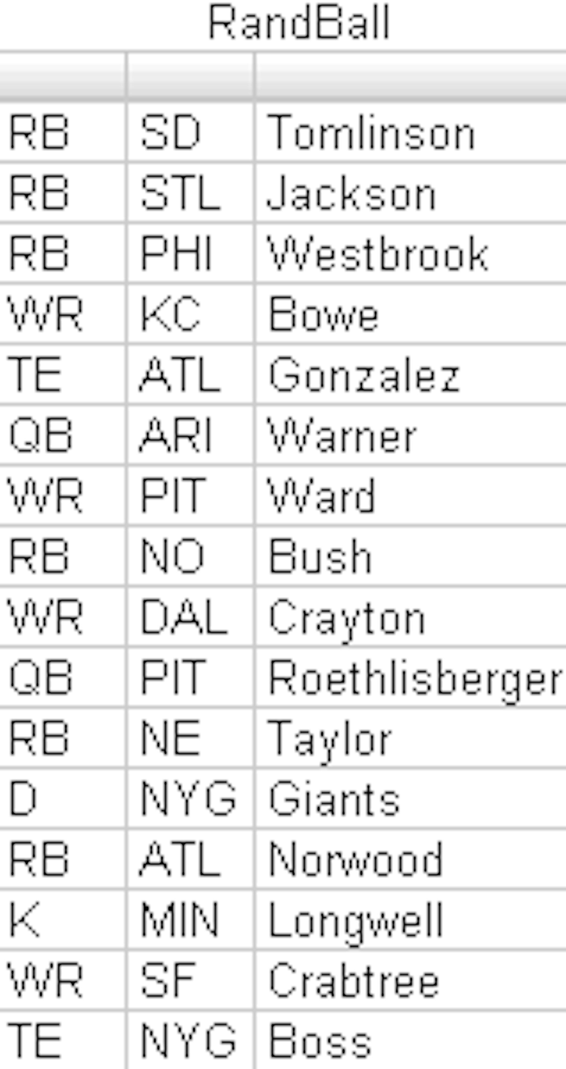 That said, let's start by throwing a bouquet at Roughkat. Great job organizing last night's RandBall Varsity Fantasy Football Draft. Aside from Toonces51 struggling early with Google chat and Stu having a page refresh problem once that led him to be seven picks behind and wondering why everyone was taking so long when really it was his turn, things went really well. As smooth as could be expected, we would say, for a bunch of disorganized guys.