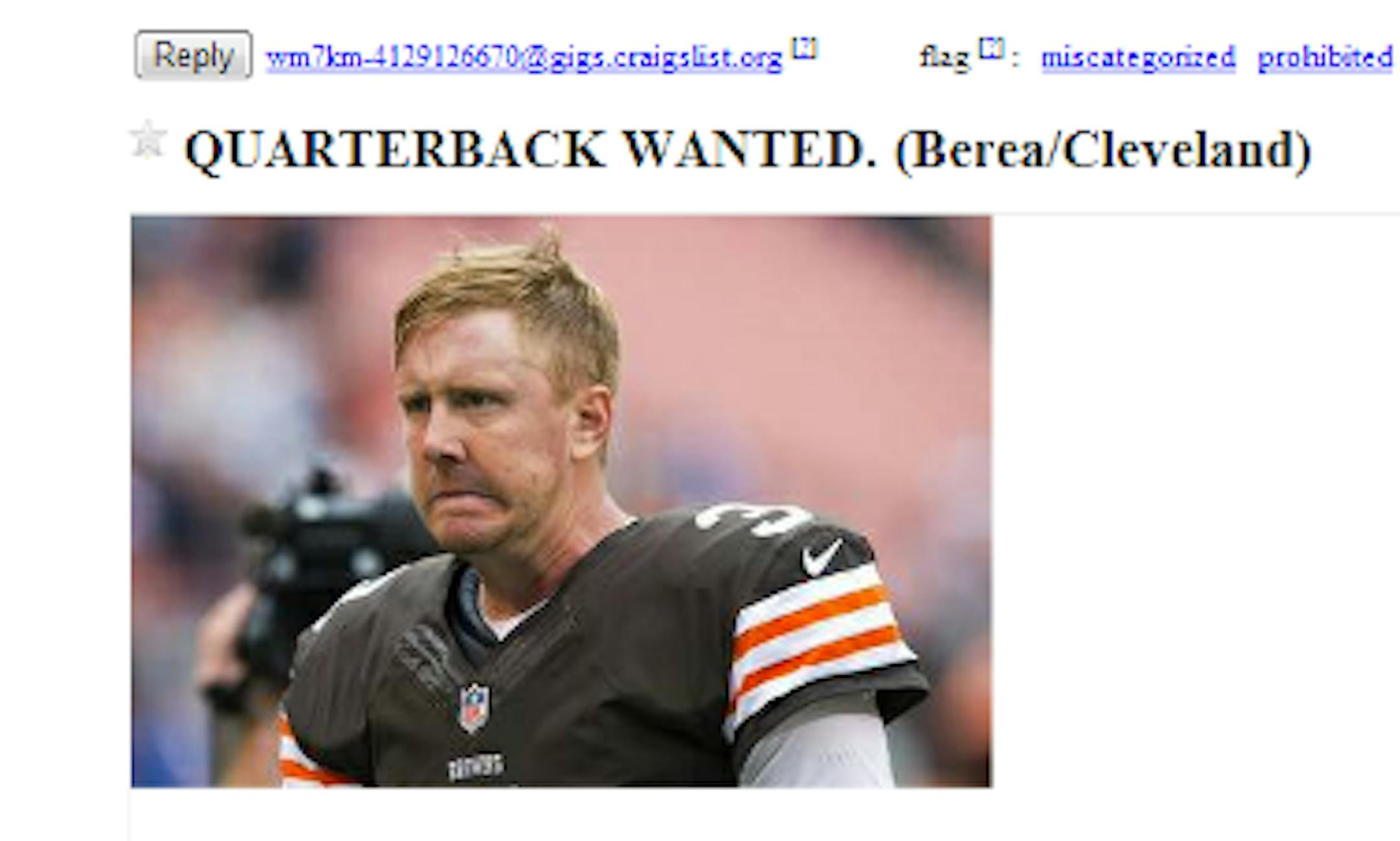 Nobody in Minnesota, at least not yet, has put the Vikings' starting quarterback job on Craigslist. That is what happened in Cleveland, which had brief success this year with Brian Hoyer but is now back to Brandon Weeden. A fan actually put the job on Craigslist. You can read the whole thing here, but this is an excerpt: