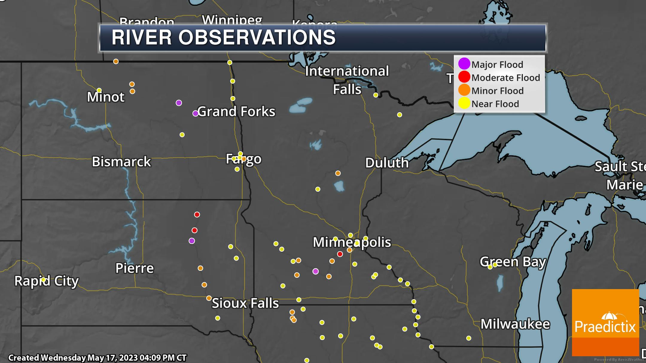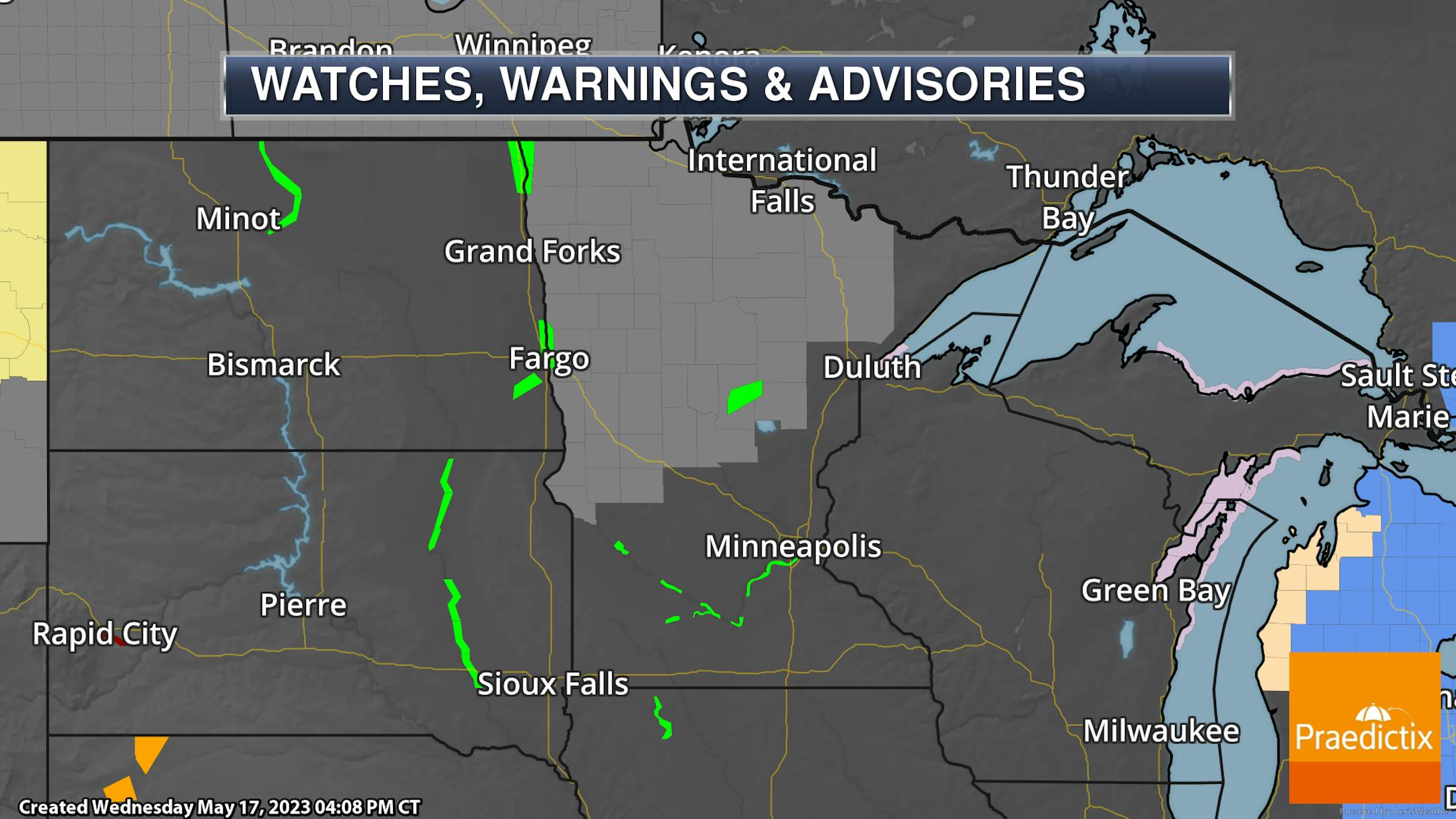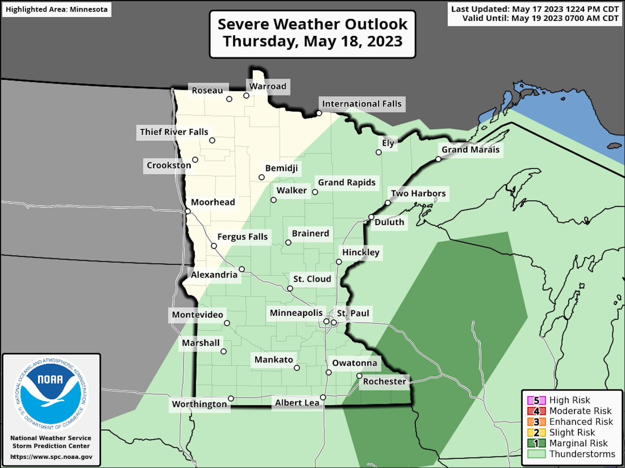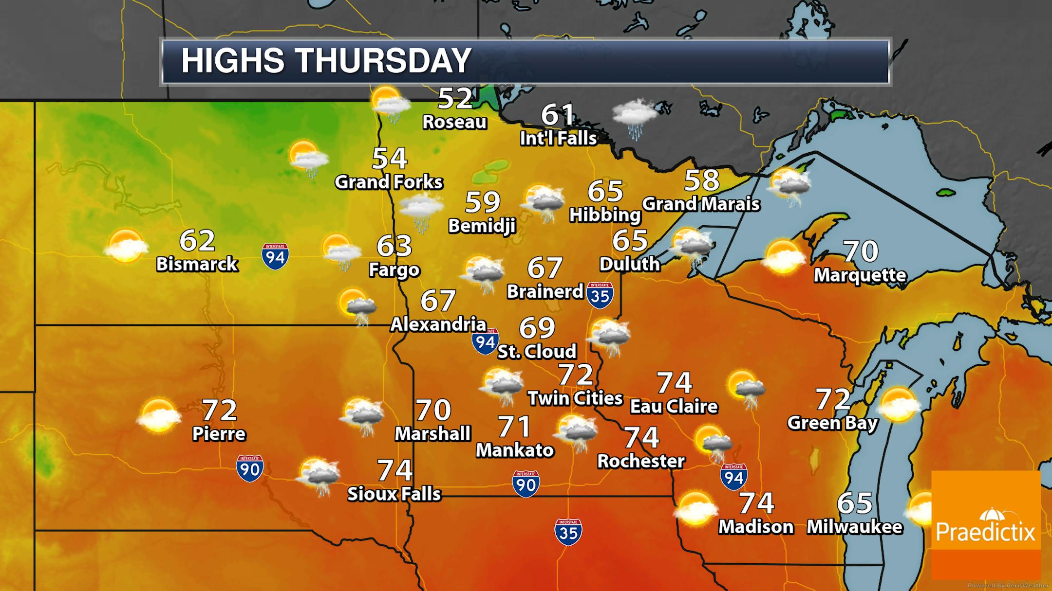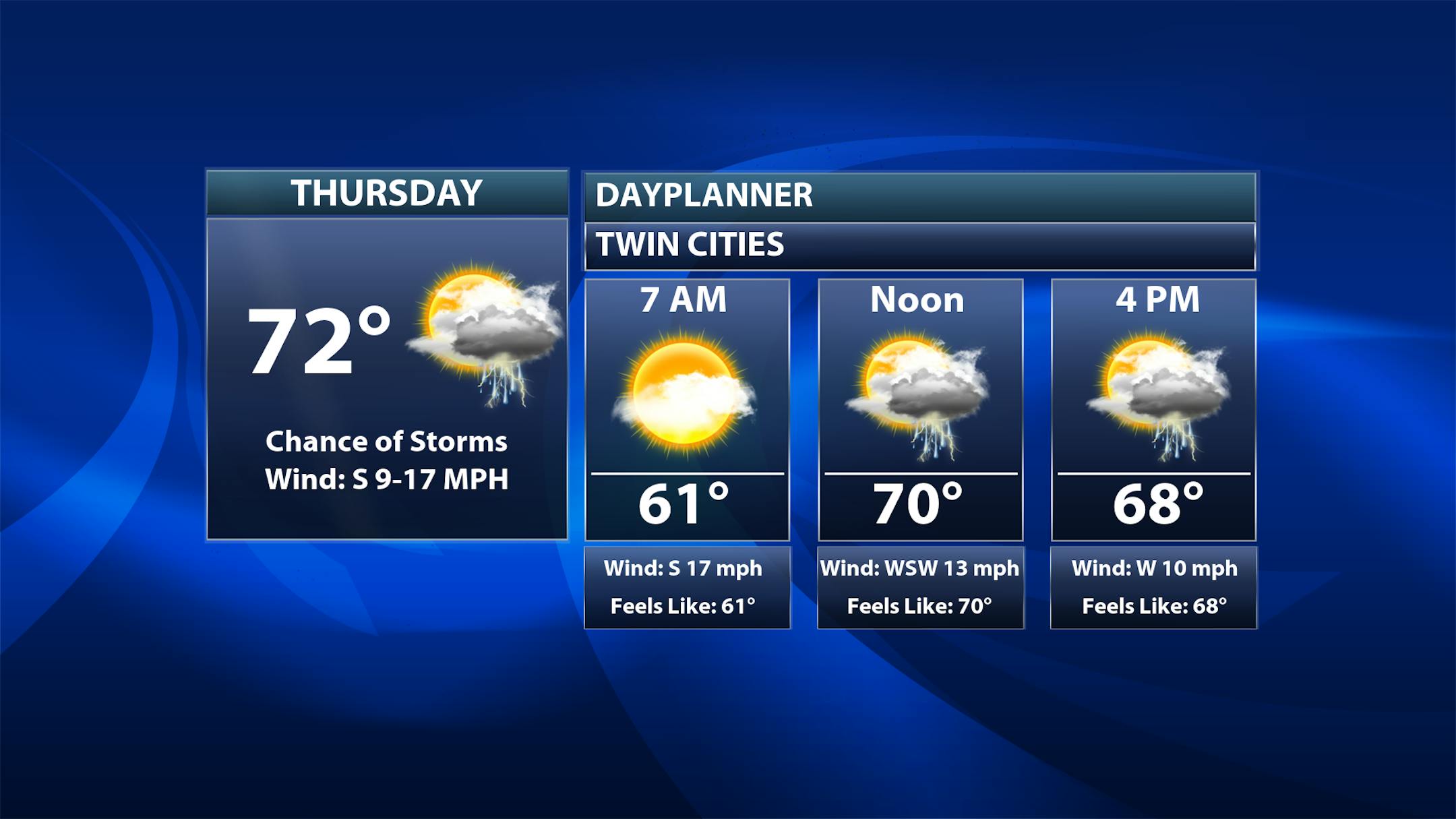 So as we head through Thursday we will be watching those couple rounds of showers and storms moving through the state along with a cold front. That front will bring cooler conditions into northwestern Minnesota, with highs only in the low 50s. Farther southeast, temperatures will climb into the 70s before that front arrives midday/early afternoon.