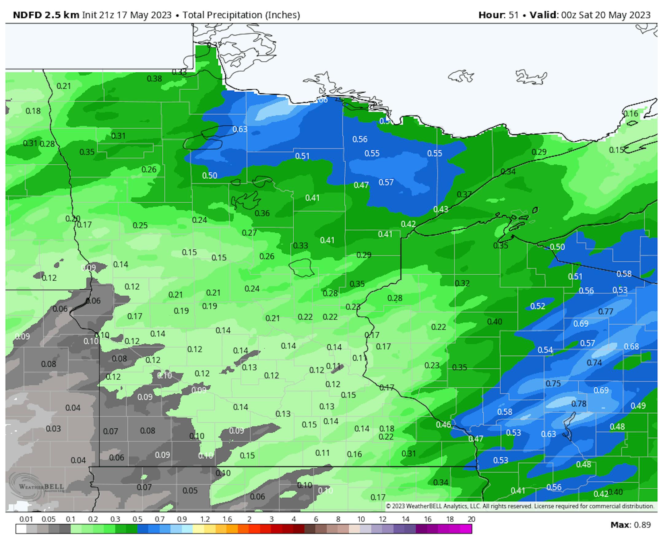Rain with this system through the end of the week will generally be on the lighter side, with the best chances of seeing a quarter inch or more across the northern third of the state (where some half-inch or more tallies are possible) and in far southeastern Minnesota. Your rainfall may vary, though - especially if you end up under a thunderstorm.