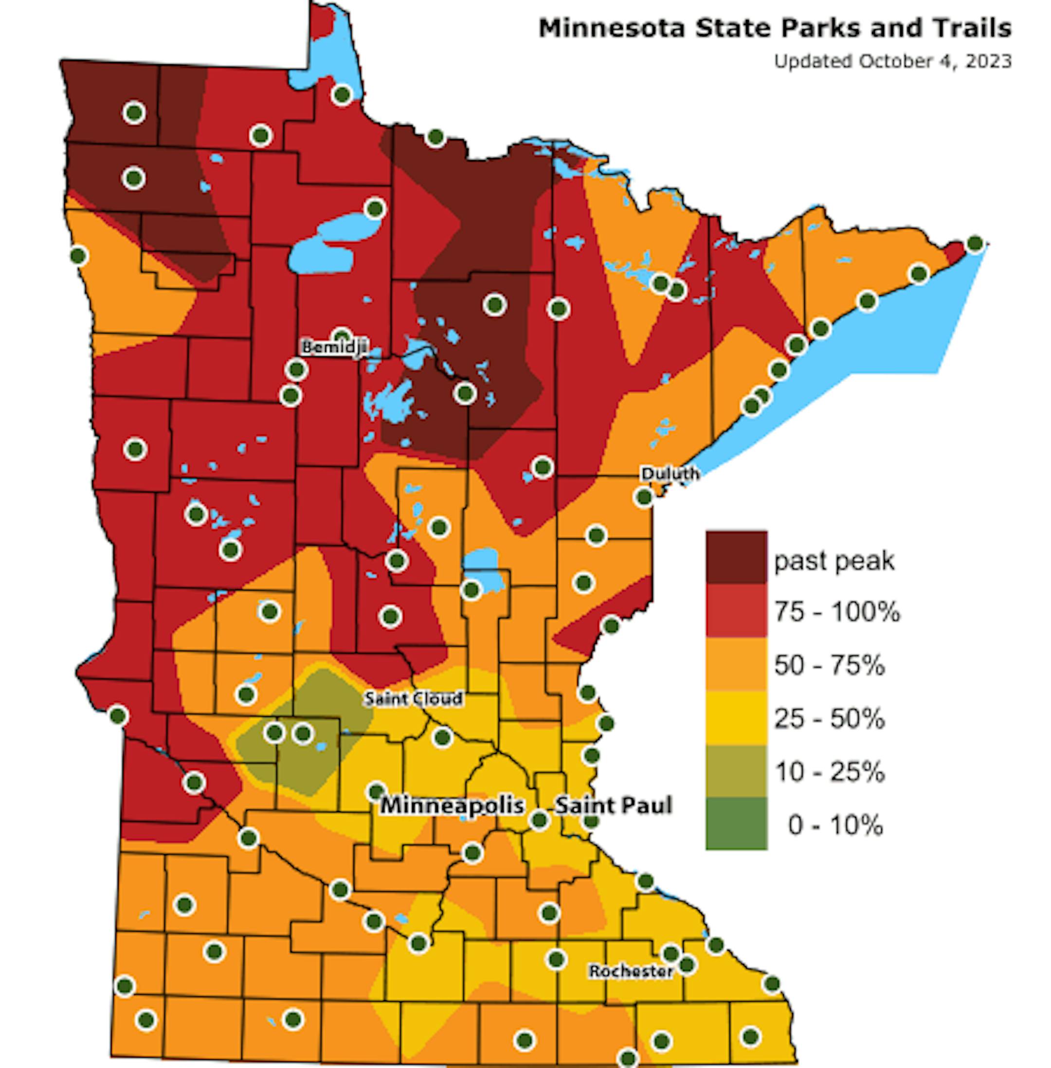 Here's a picture from the Mille Lacs Kathio State Park in late September from Marilyn A Schleper and the DNR Staff. There were a few hints of color a couple of weeks ago, so colors should be well on their way there.