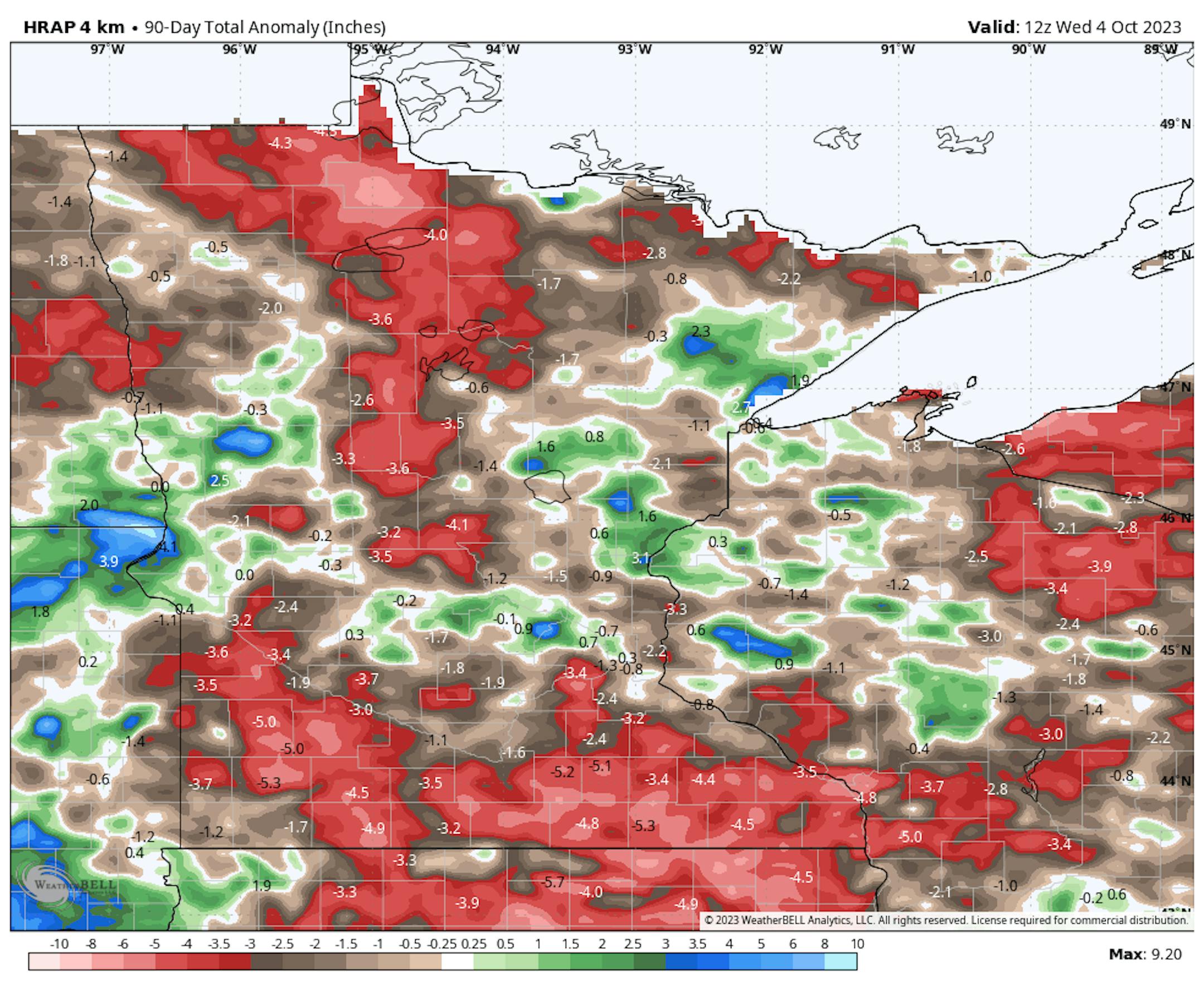 Thanks to some recent heavy rains parts of the state are now in a surplus over the last 90 days. Some of the biggest surpluses (which aren't many) are showing up in blue in pockets along and north of the Twin Cities and also just east of the metro in western Wisconsin.