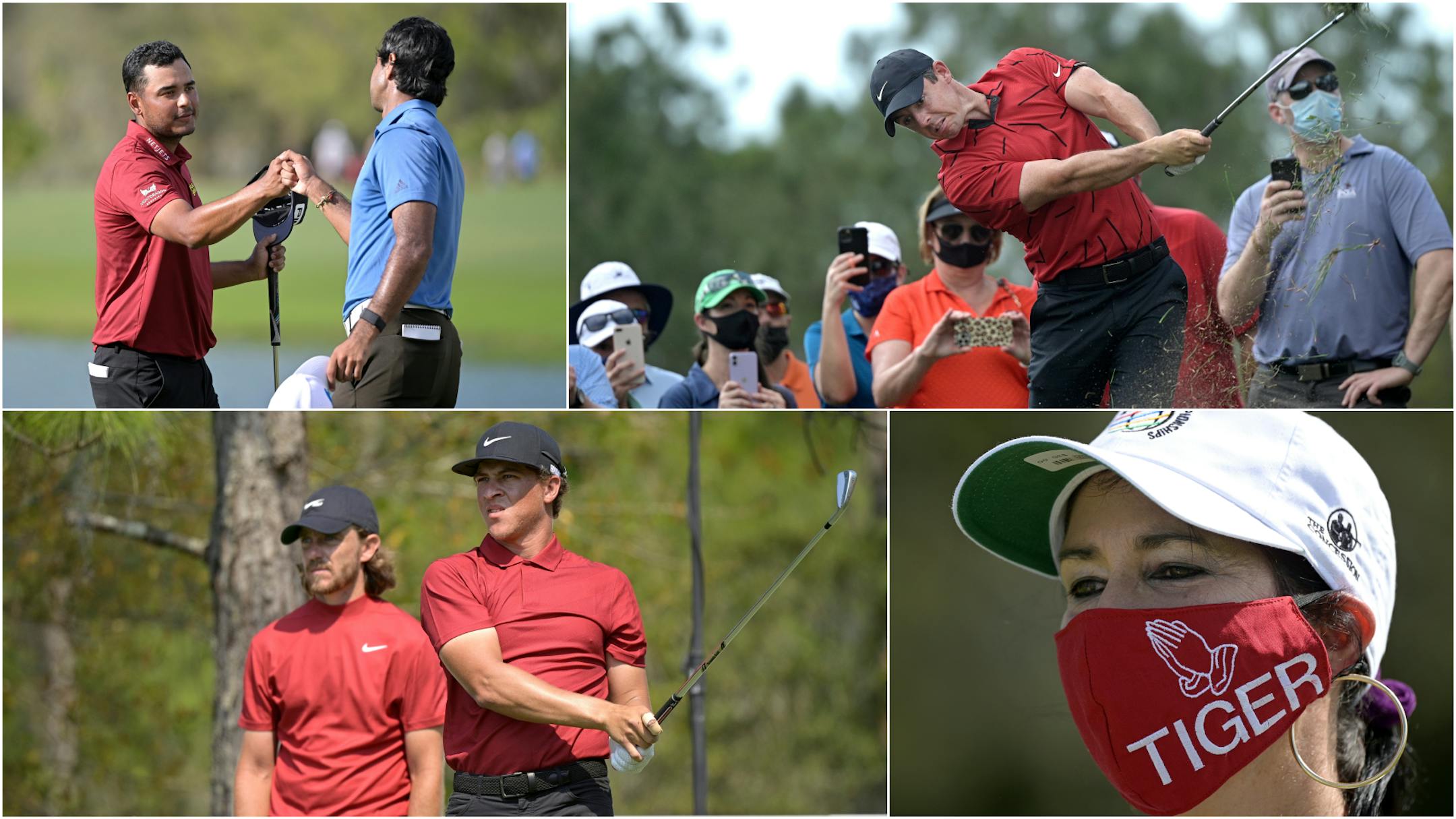 Some golfers and fans paid tribune to Tiger Woods on Sunday: They included Tommy Fleetwood and Cameron Champ (lower left), Sebastian Munoz (top left), Rory McIlroy (top right) and fan Desiree Kapica of Sarasota, Fla. (AP photos/The Minnesota Star Tribune)
