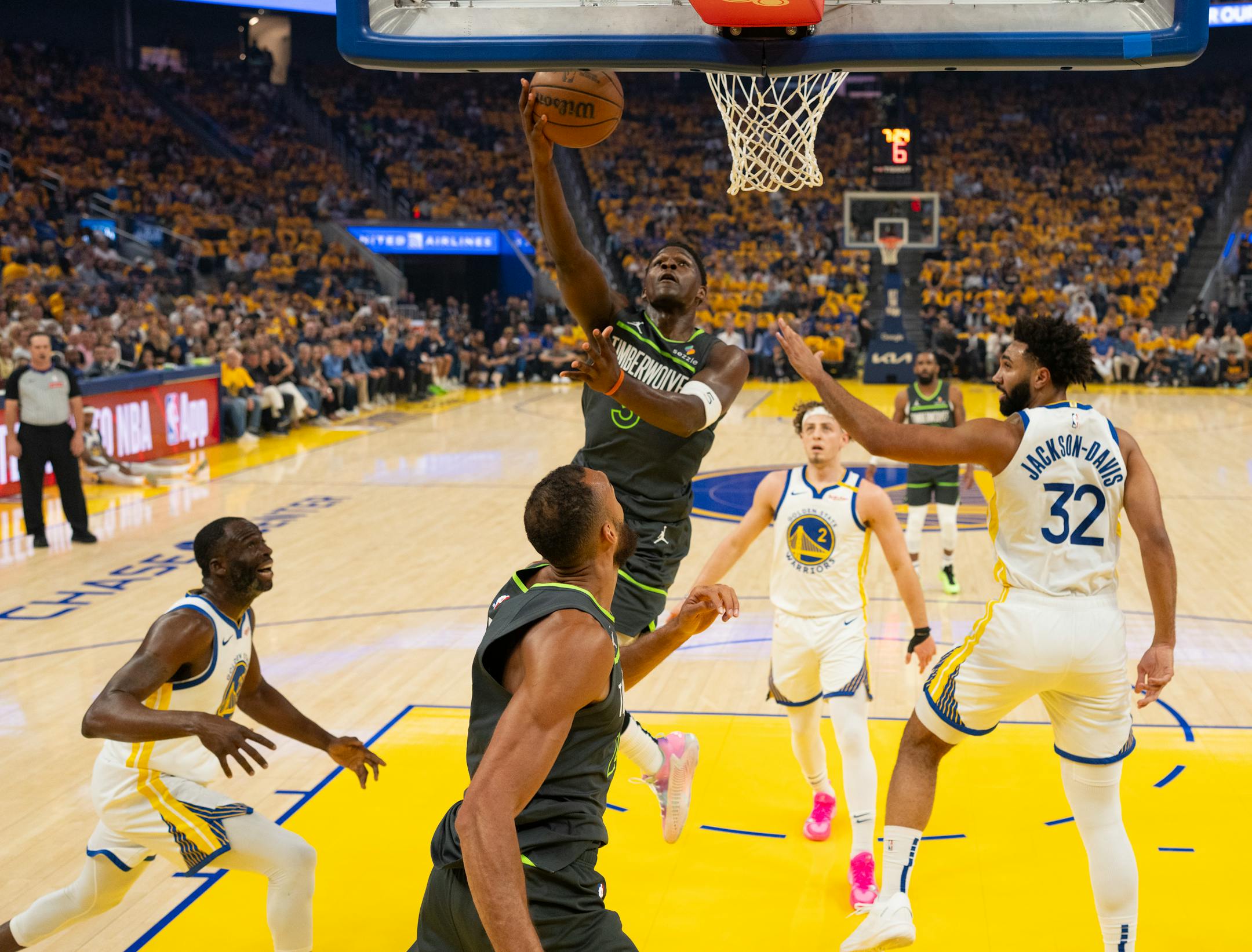 A 7-0 Wolves run gave them an 84-82 lead on an Edwards three with 6:16 to play. The teams traded stops before Draymond Green fouled out of the game with 4:38 to play after picking up two fouls in two possessions, the fifth coming after the Wolves won a challenge to overturn a defensive foul on Julius Randle to an offensive foul on Green. The Wolves led 87-84 when a three from Jaden McDaniels put them up six with 3:20 to play. Then Rudy Gobert put them ahead 93-86 with a dunk and three-point play with 2:05 left. An Edwards three off his own previous miss put the Wolves back up seven and Conley clinched the game on the defensive end by drawing an offensive foul.