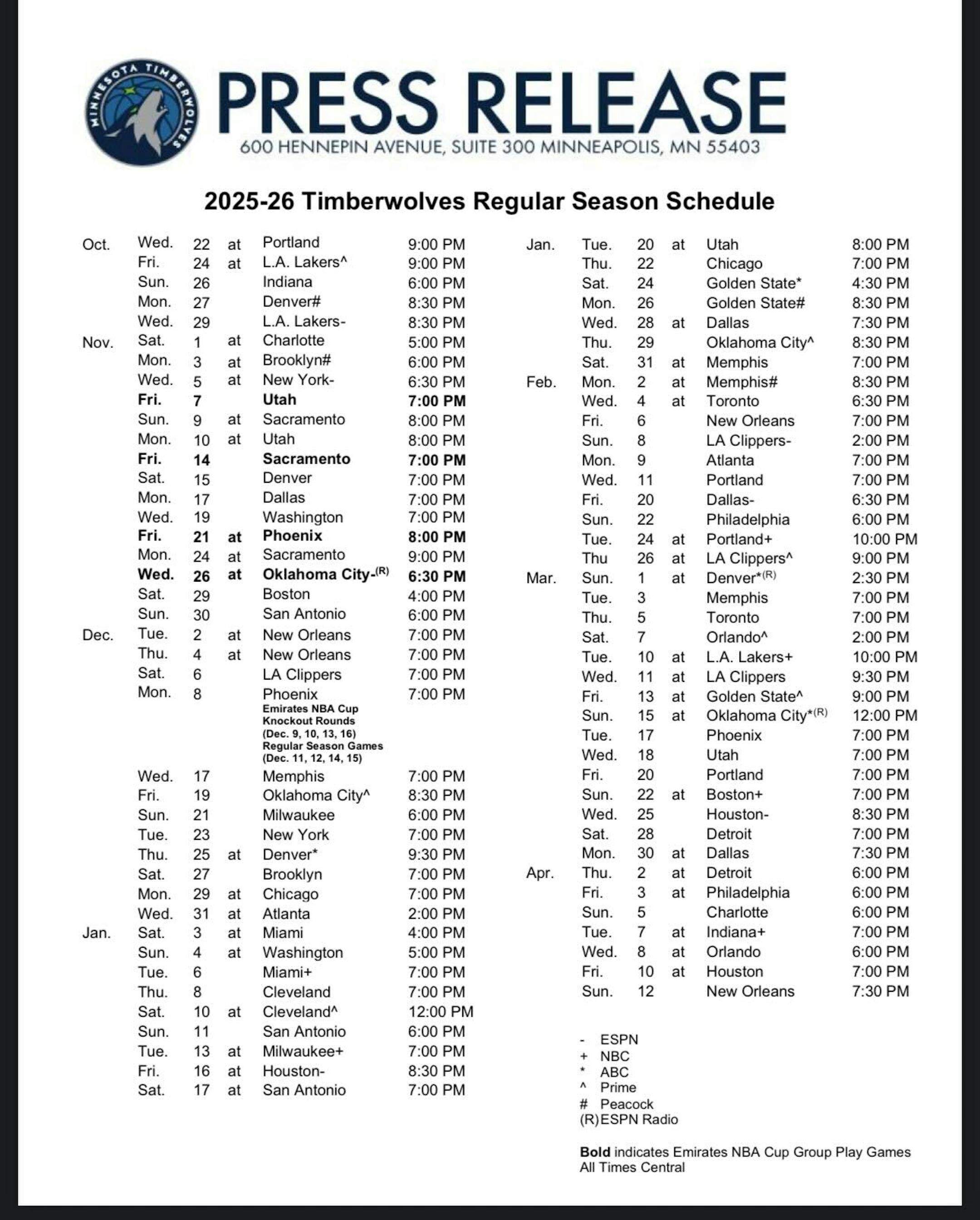 In all, the Wolves will play 28 games across those three platforms. Included in that count is the Wolves’ previously announced Christmas Day matchup in Denver.