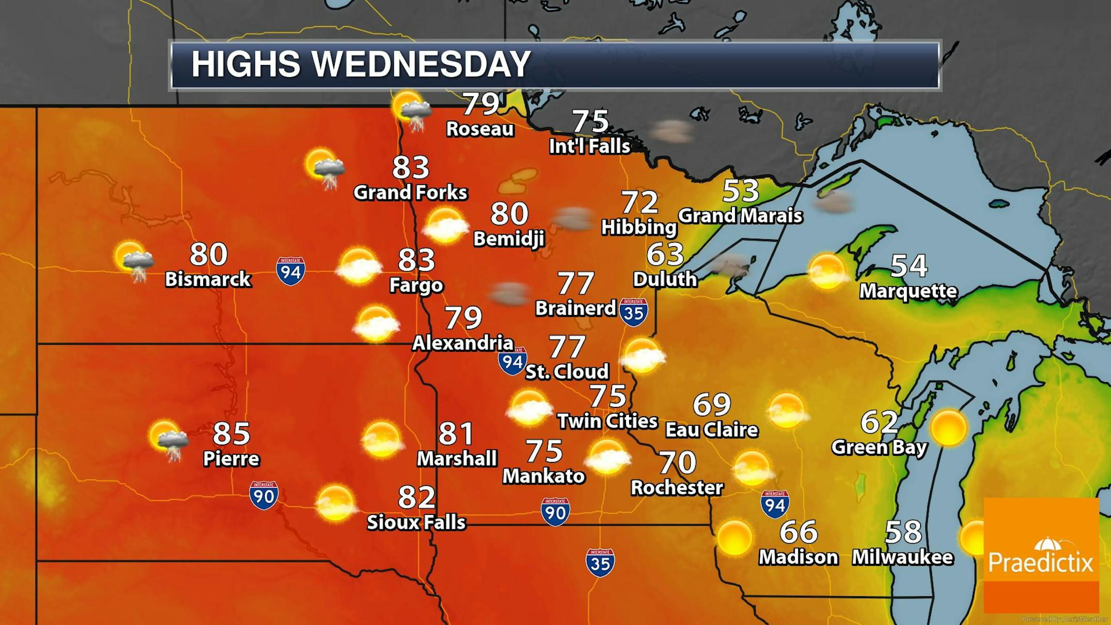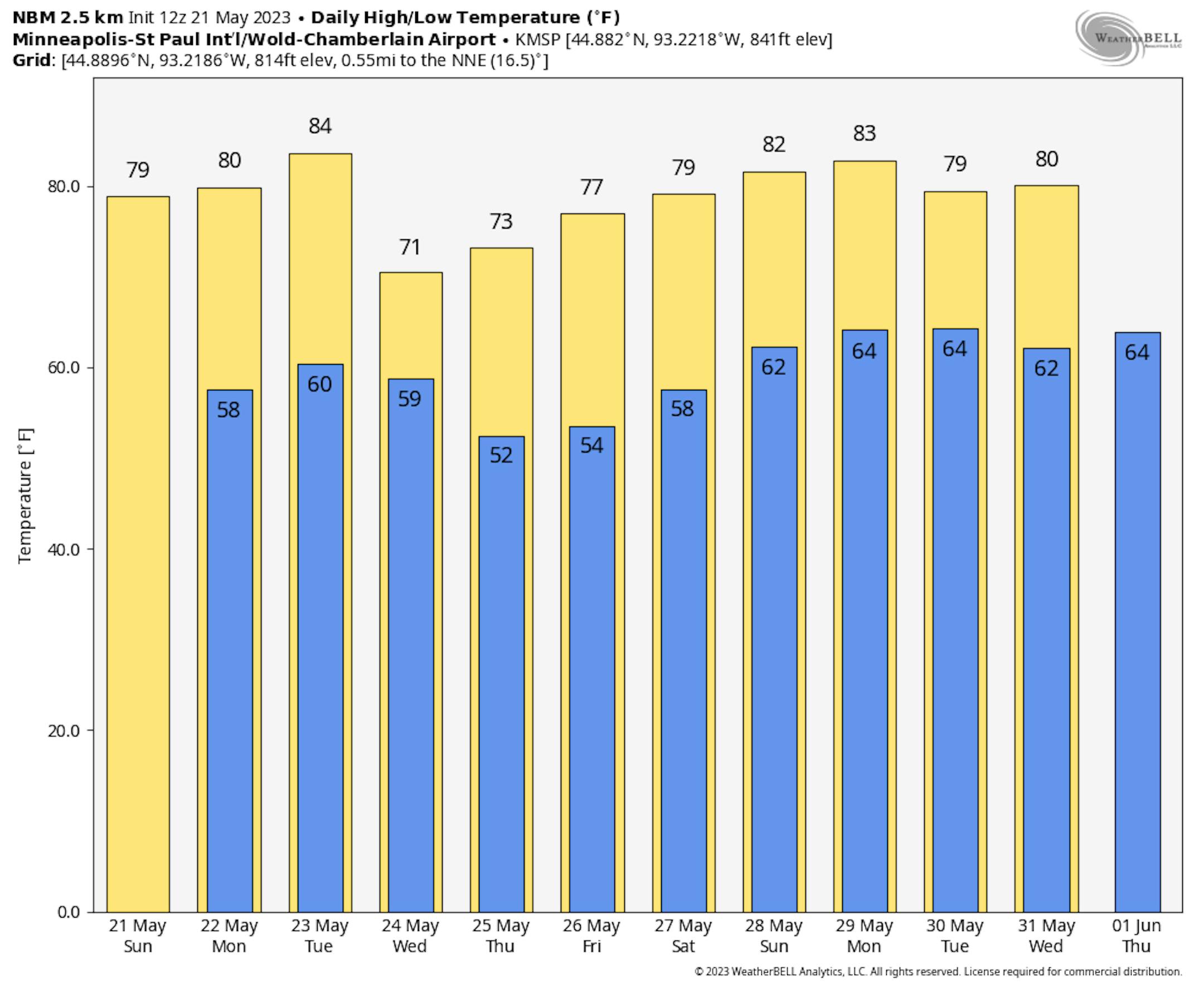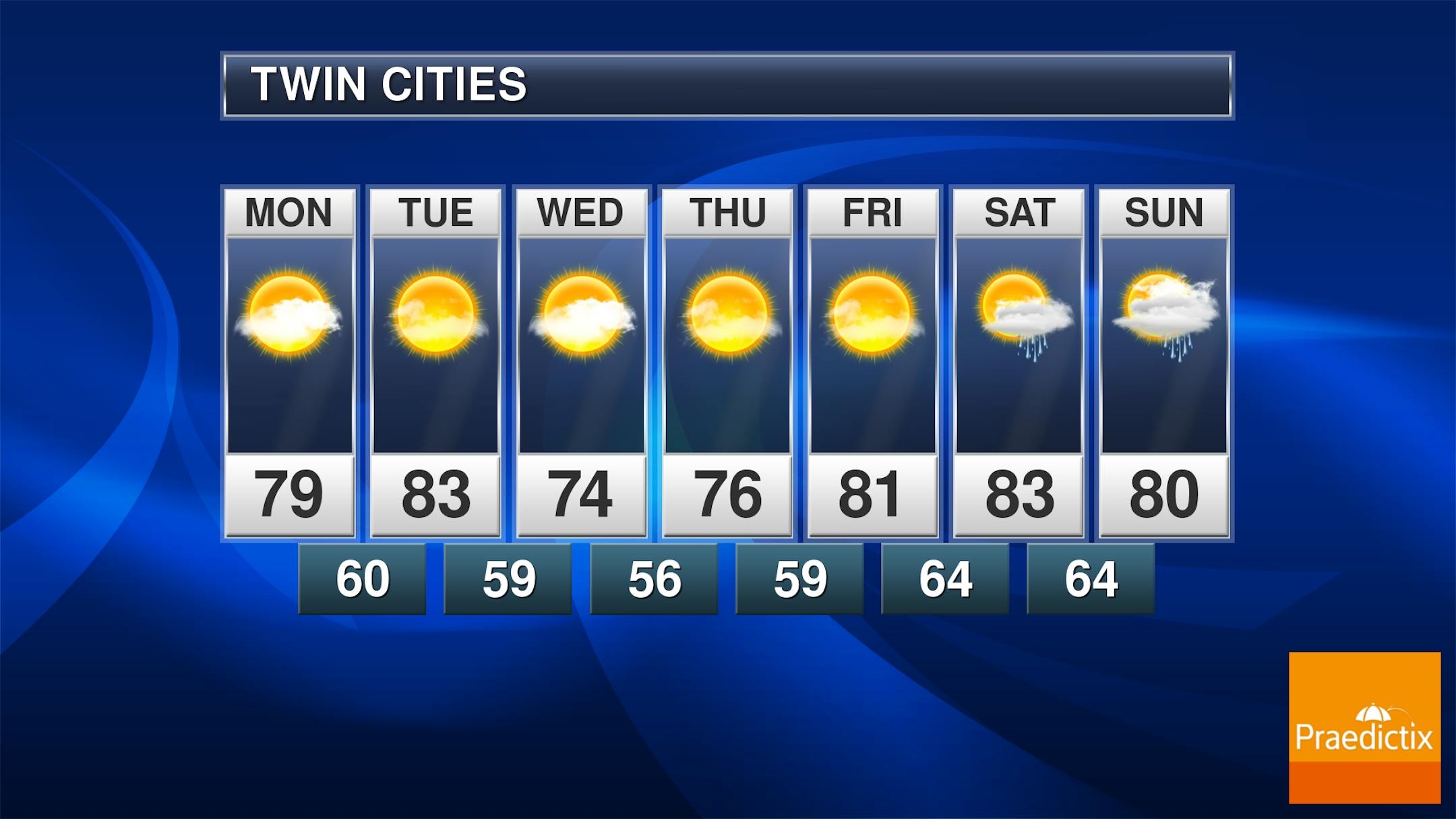 The weather outlook for the Twin Cities on Monday, May 22nd shows another sunny and mild day with highs warming into the upper 70s to near 80F for the Twin Cities. Thanks to Canadian wildfires, skies will be fairly smoky/hazy with some minor air quality concerns across parts of the state