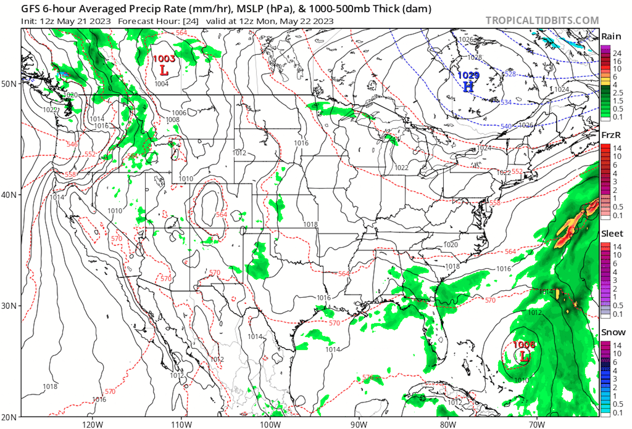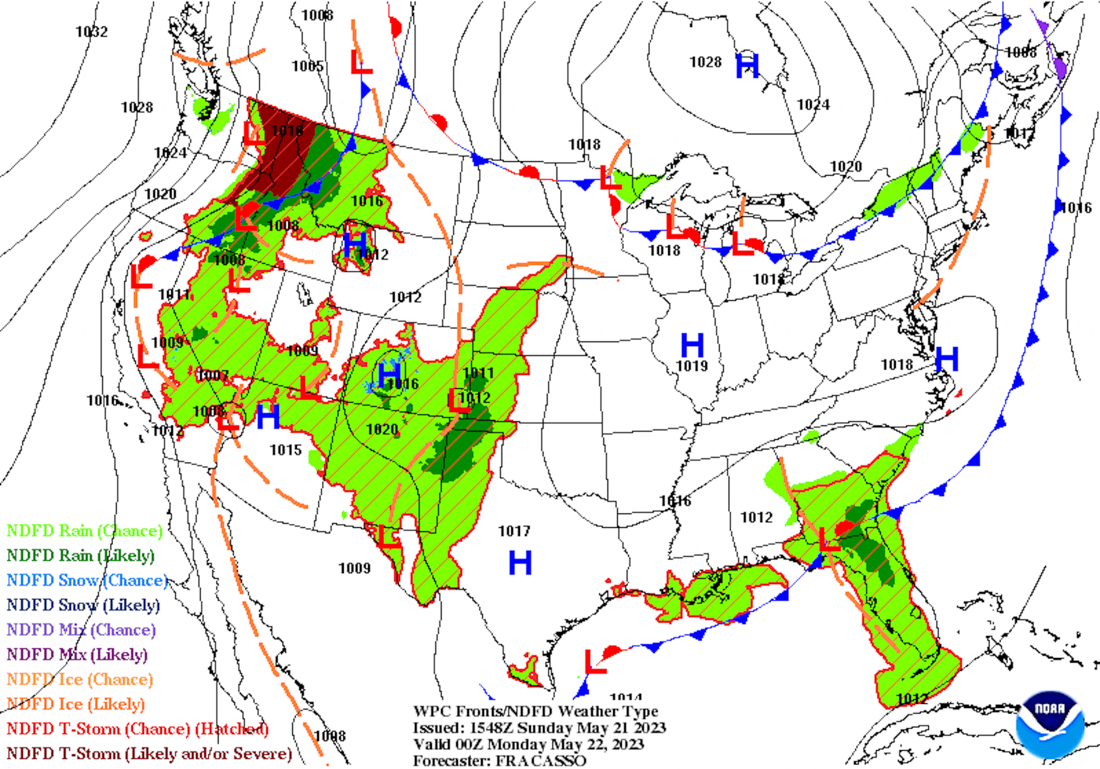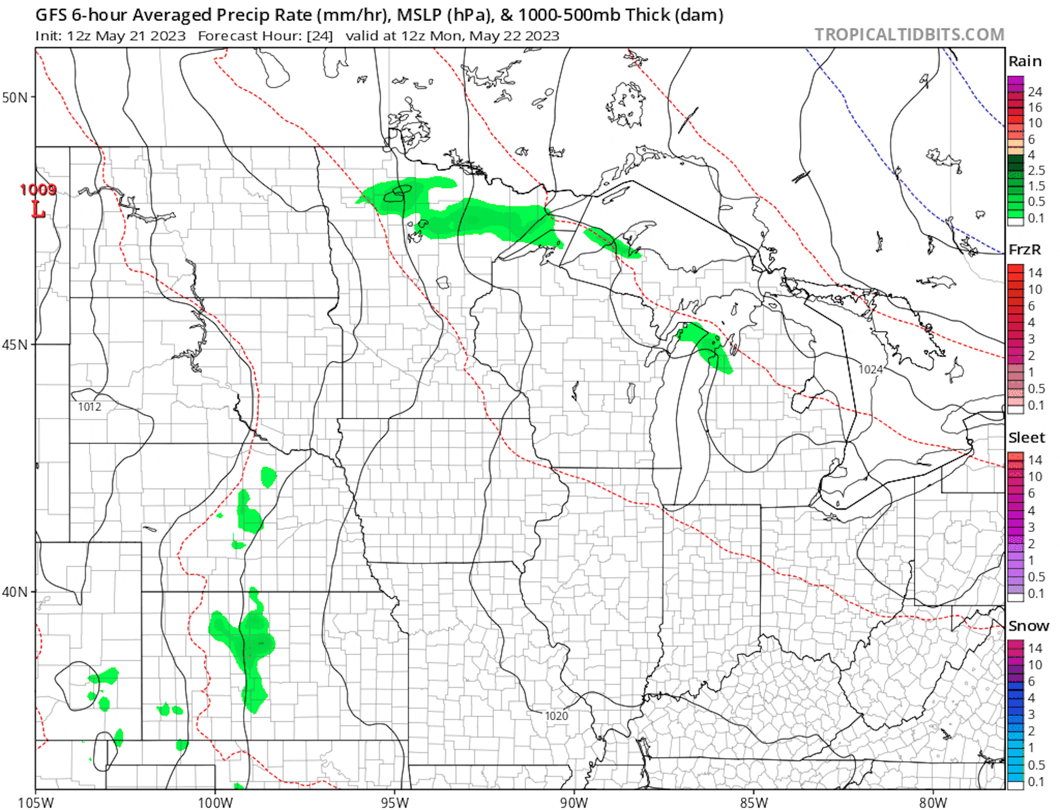 The weather outlook for the Twin Cities on Monday, May 22nd shows another sunny and mild day with highs warming into the upper 70s to near 80F for the Twin Cities. Thanks to Canadian wildfires, skies will be fairly smoky/hazy with some minor air quality concerns across parts of the state
