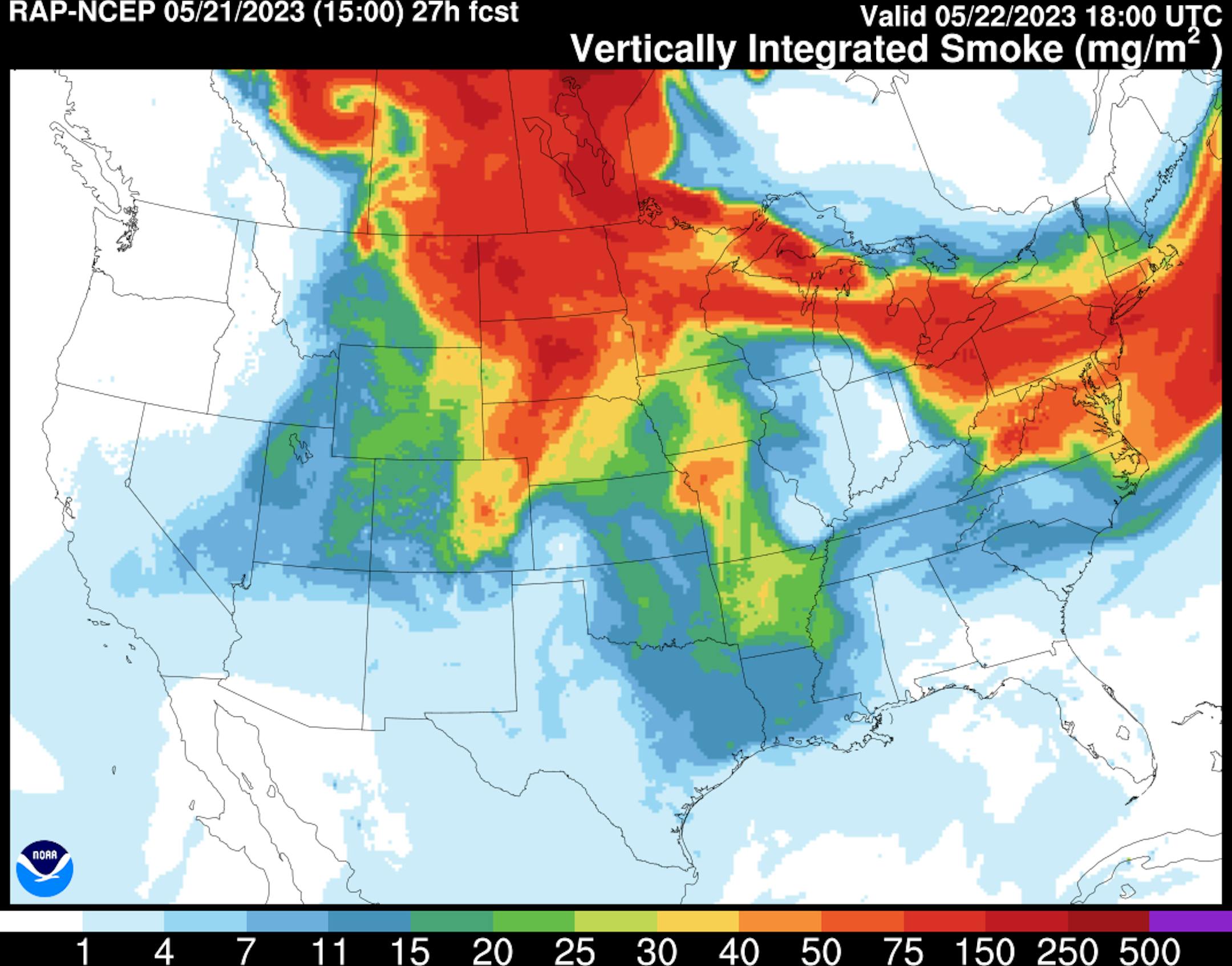 The smoke analysis by midday Monday shows widespread smoke overhead across the Upper Midwest and Great Lakes Region thanks to wildfires burning in Canada. This will make skies smoky and hazy through much of the day.