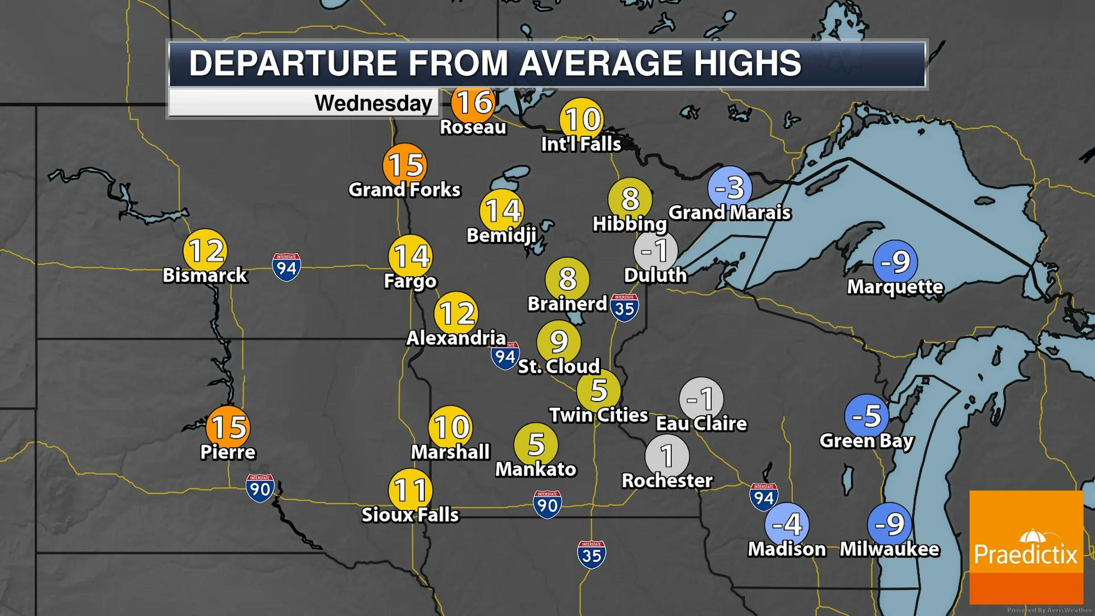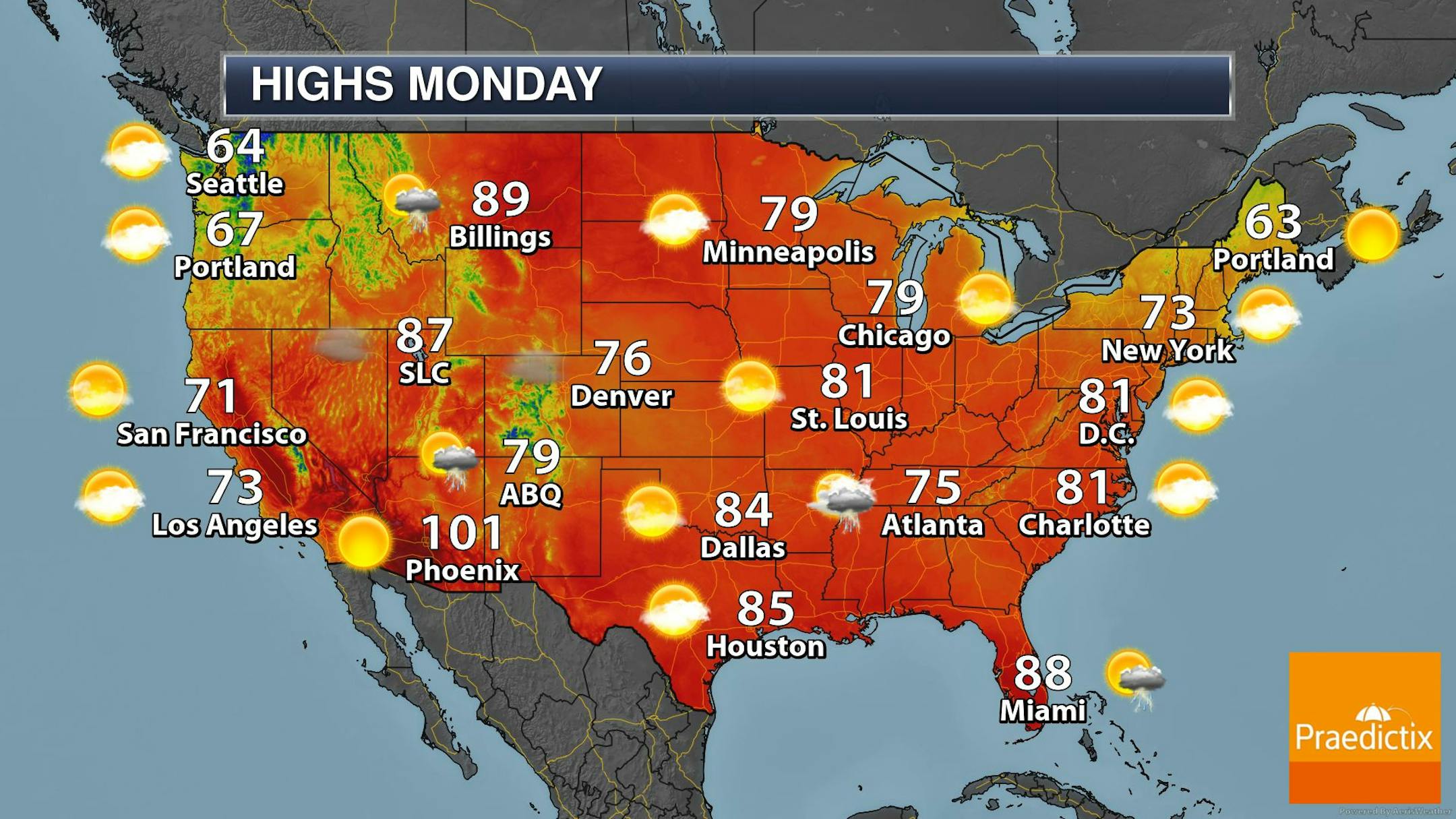 Temps on Monday will be nearly +5F to +15F above average across the region with highs warming into the 70s and lower 80s, which is more like mid-June standards. Skies will remain smoky and hazy for much of the day as well.