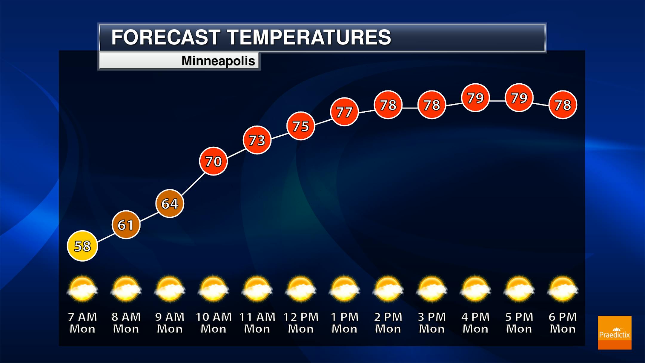 The hourly temps through the day Monday show temps starting in the mid to upper 50s in the morning and warming to near 80F by the afternoon. Skies will generally be sunny, but smoke from Canadian wildfires will keep skies smoky and hazy throughout the day. Southerly winds will be a bit breezy with some 15mph at times.