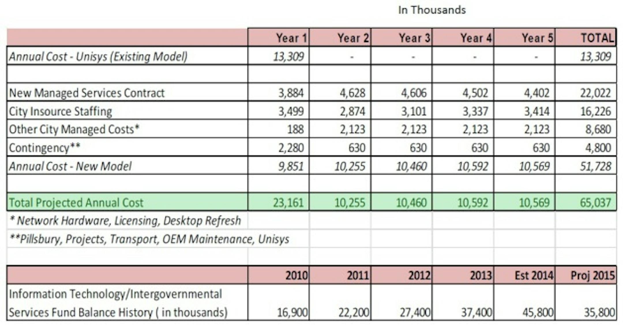 The transition itself will cost about $10 million, since the city has to hire new employees and purchase equipment owned by Unisys. But that cost will be covered by past charges to city departments that have accrued in an account now worth $45.8 million (see slide below).