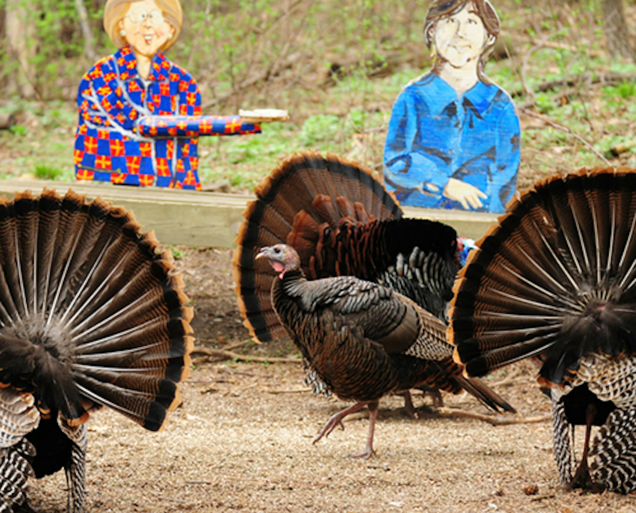 A couple of days ago I watched Wild Turkey courtship at Westwood Nature Center in St. Louis Park. Three male turkeys were strutting for one disinterested female. The males are gorgeous this time of year, facial colors looking like they are lit from within. The images of people you see in the background are painted plywood cutouts circling a bird-feeding site. The idea is to acclimate birds to the presence of people so when you and I sit down to watch, the birds will not be alarmed. The turkeys were too intent on mating possibilities to not be in the least concerned about a nearby photographer.
