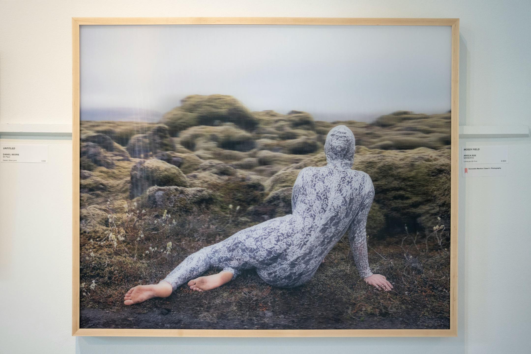 In Roe’s lenticular photograph, a woman dressed in a body suit, her back to the viewer, rests on a hill overlooking a surreal mossy landscape. The image calls to mind references to the body as landscape while also creating something otherworldly.