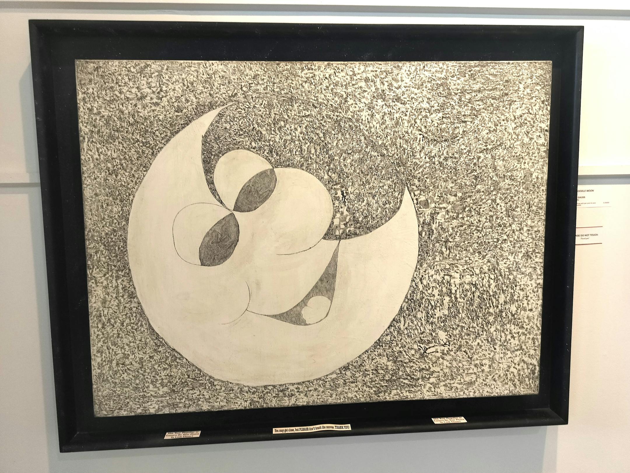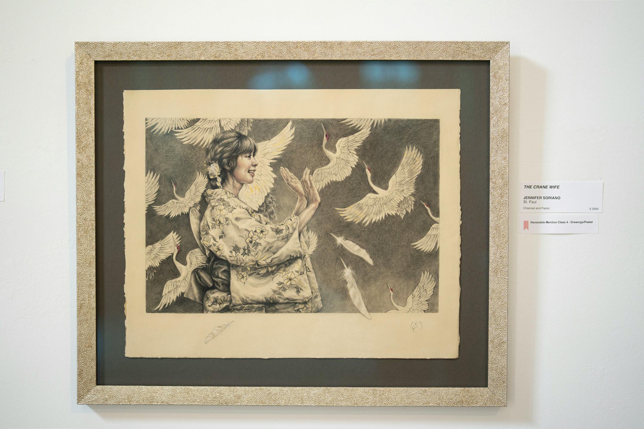 This hyperrealistic charcoal and pastel drawing of a woman surrounded by cranes references a tale from Japanese folklore in which a crane tricks a man into thinking it’s a woman so he’ll marry it. It’s also a reference to CJ Hauser’s essay “The Crane Wife,” which went viral in 2019. Either way, this detailed drawing shimmers.