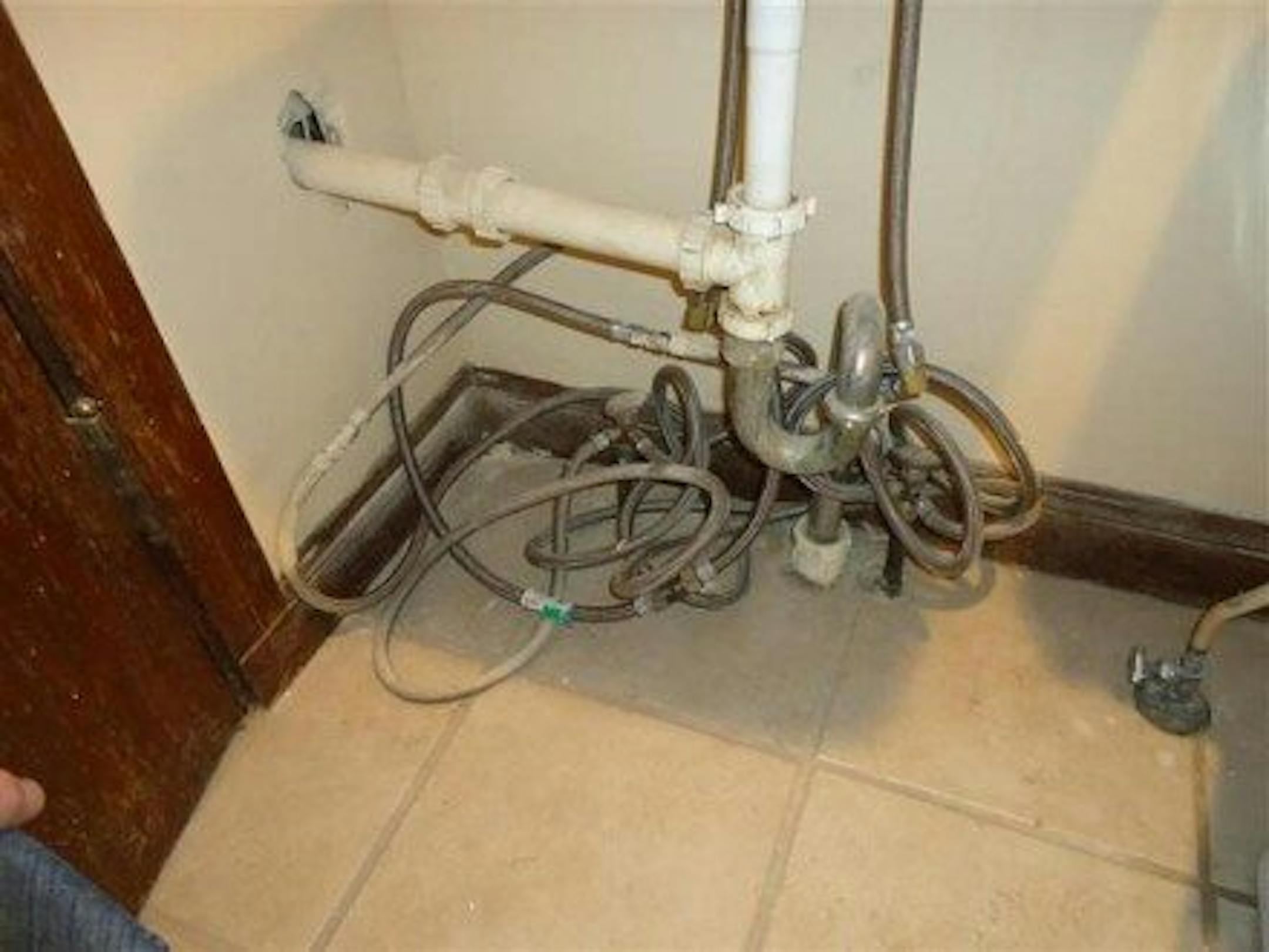 Leaking Drain - Awww, isn't that cute? We noticed a bunch of water on the floor in the basement after testing all of the first floor plumbing fixtures. To confirm the source of the leak, we filled up the kitchen sink with water, pulled the drain stopper, then ran downstairs to catch the leak in action.