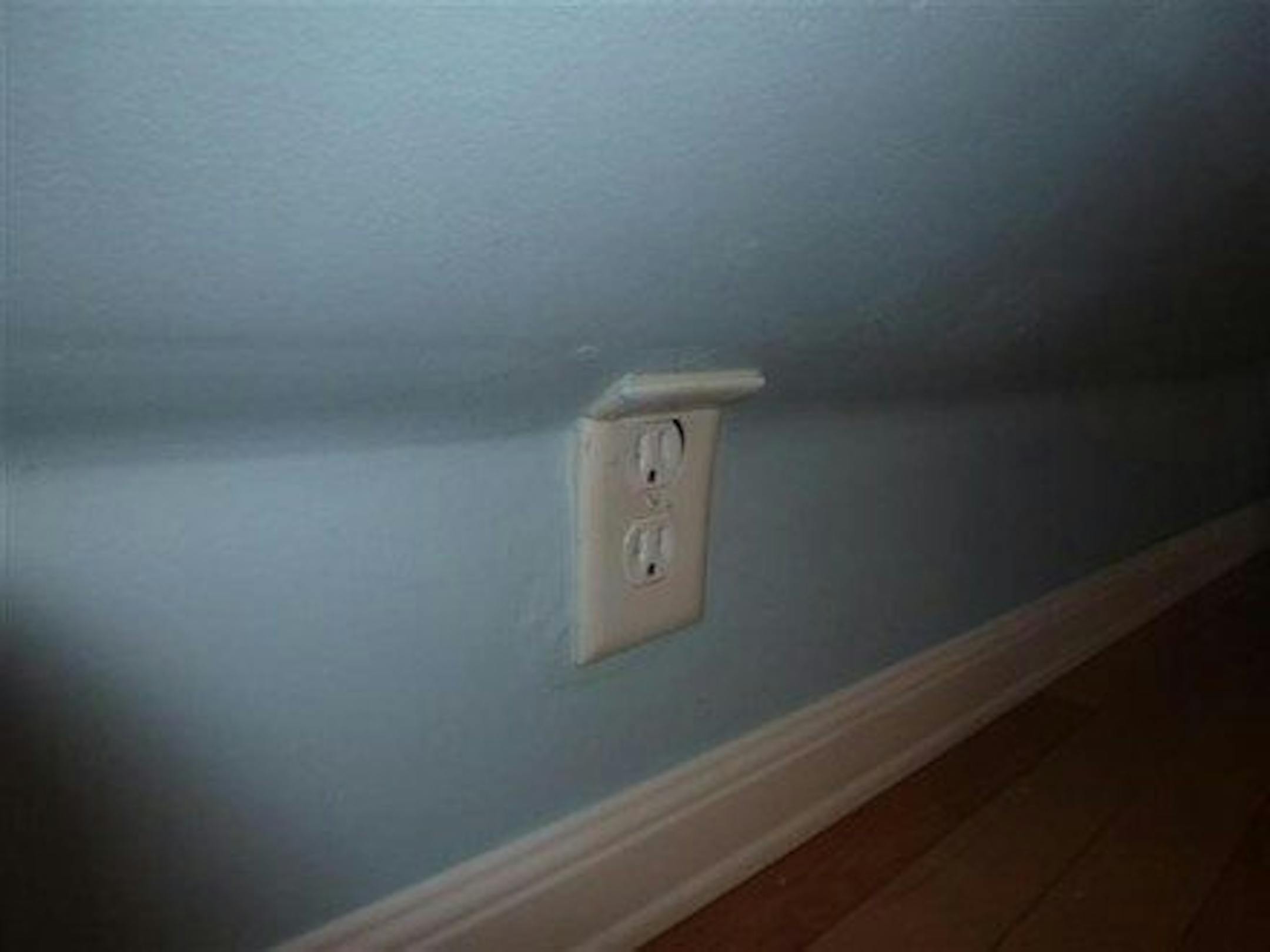 Bent Outlet Cover - Problem: I want an outlet right where the wall is angled, but I can't get the cover plate to fit. Solution: Cut the cover plate and then caulk it in place.