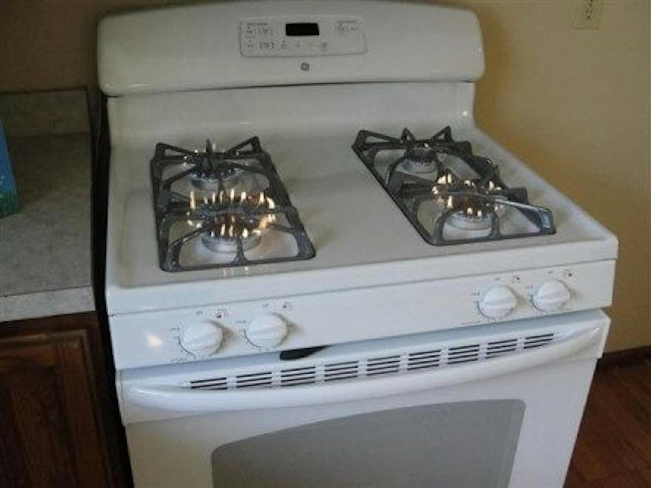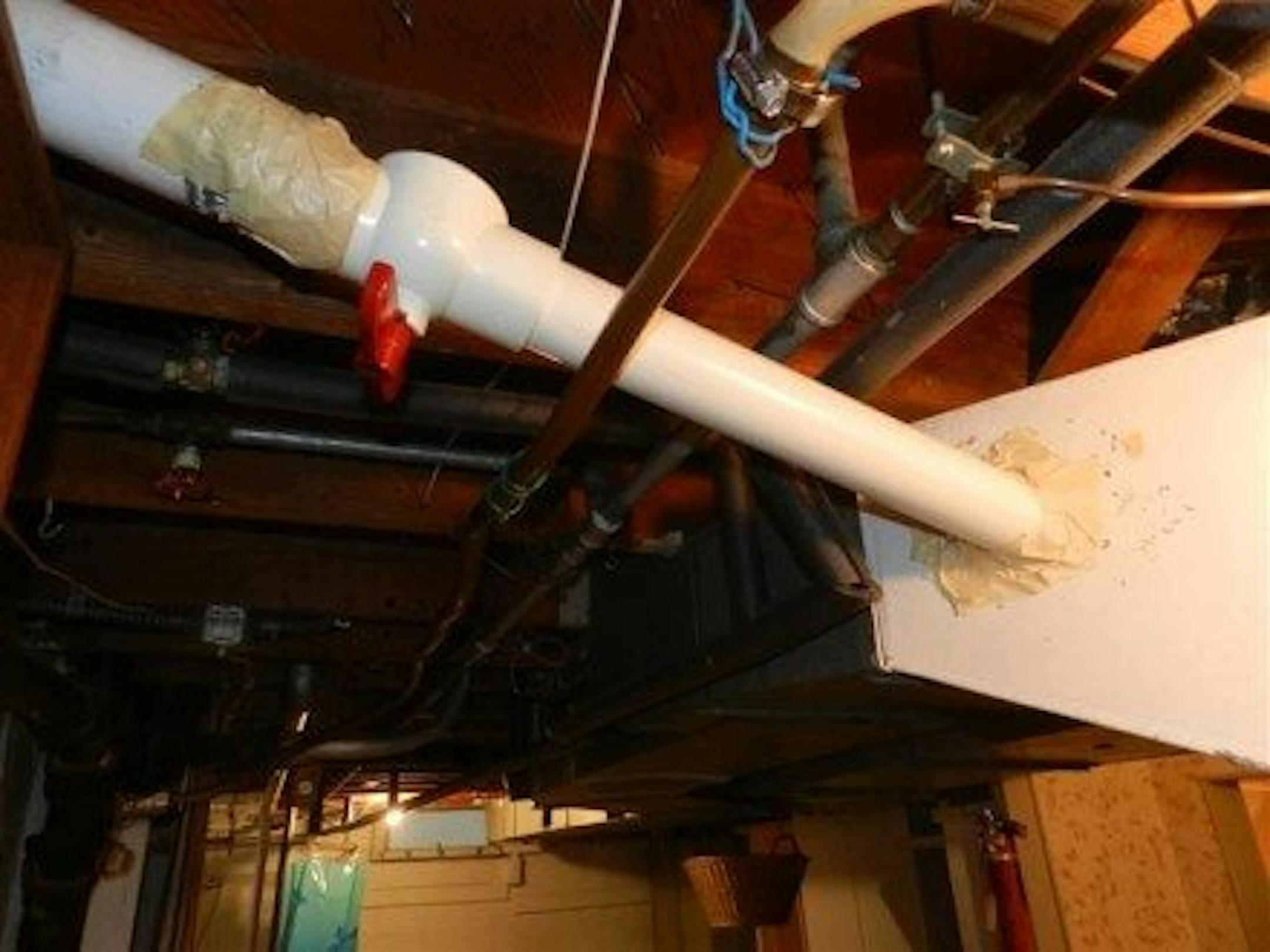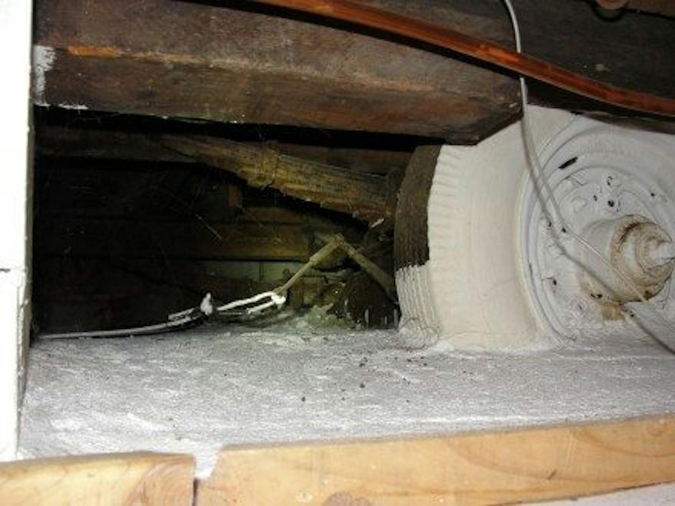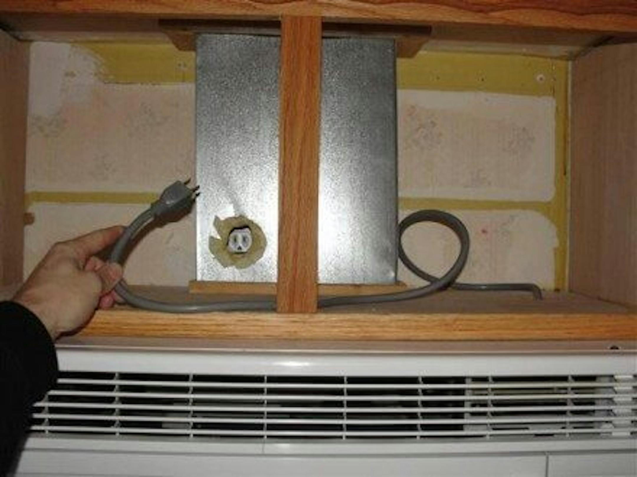 Outlet in duct - Moving the outlet would have been too much work, so someone just cut a hole in the exhaust duct for the kitchen hood fan. Nice touch with the masking tape on the sharp sheet metal edges too.