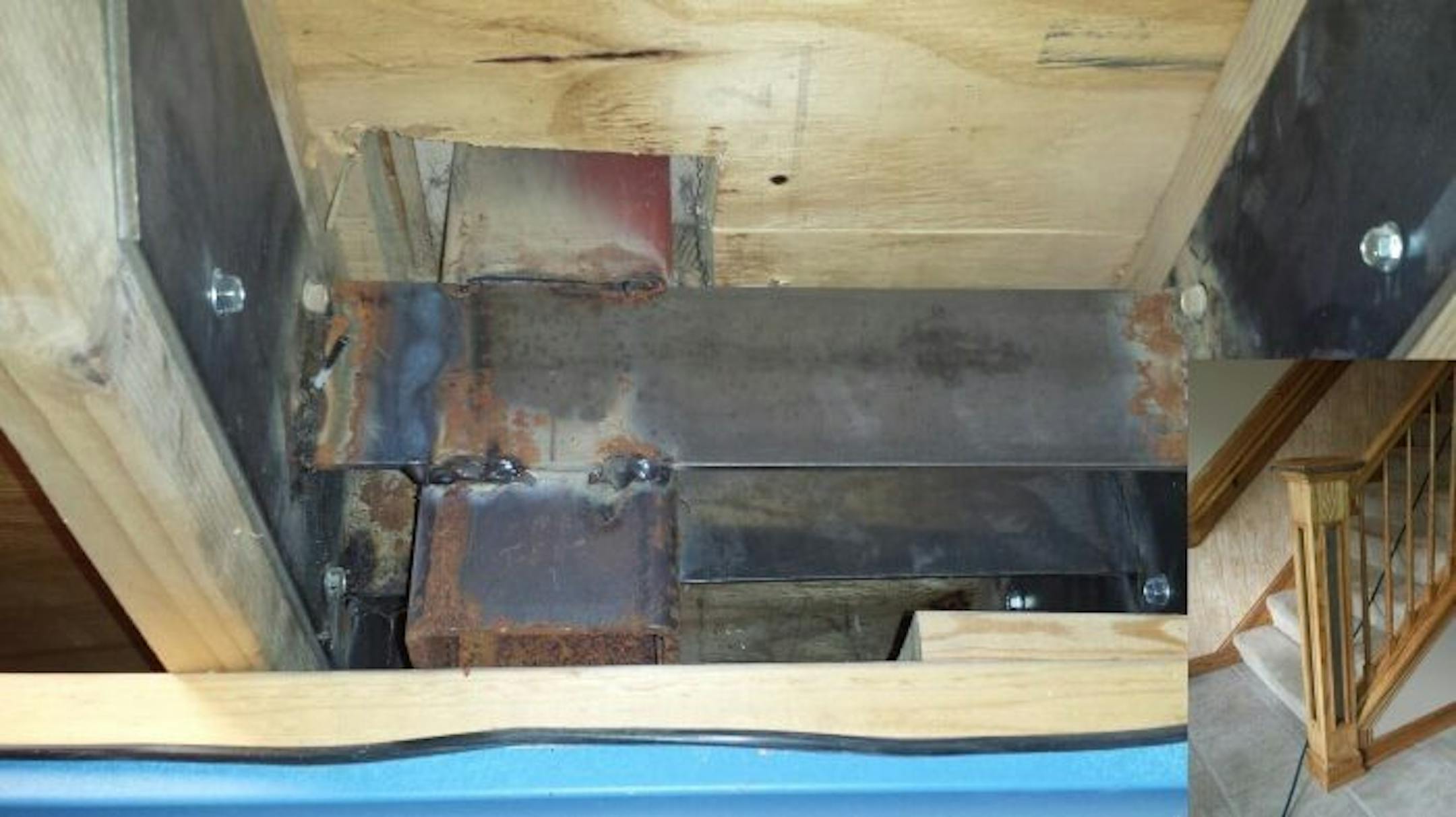 Welded steel newel post - The owner's explanation: "I don't like $#!% moving." It sure didn't move. Well done, buddy.
