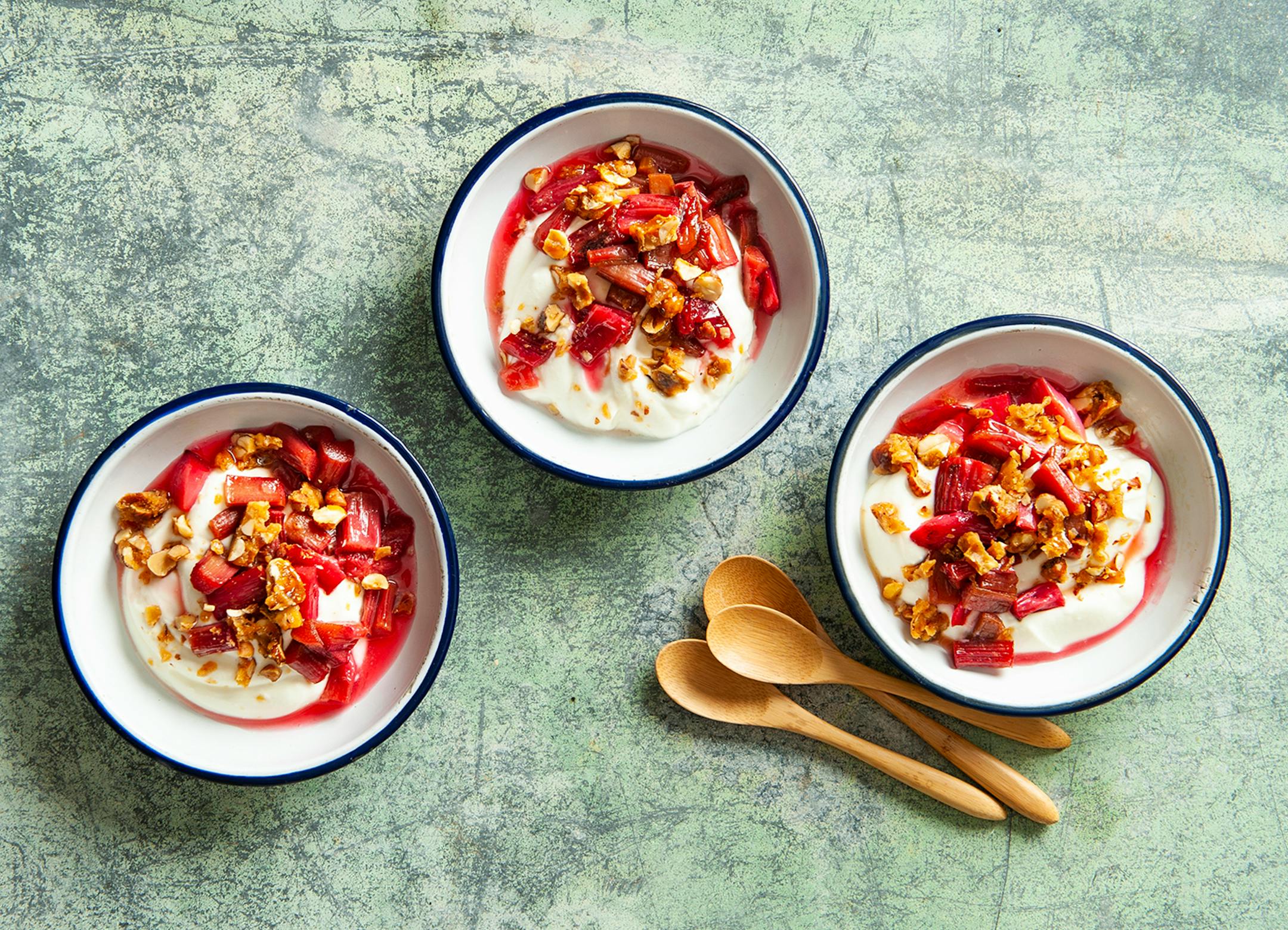 The secret to this beautiful breakfast is the fresh rhubarb sauce. Bright and tart, it adds a lively note to the creamy yogurt and crisped grains. The sauce is ready in minutes, it will keep in the refrigerator in a covered container for a good week, and it freezes nicely. When the strawberries hit the market, toss those into the mix. The key is to first simmer the fruit into a sauce before adding sugar or honey so it's not too sweet; just adjust to taste.
