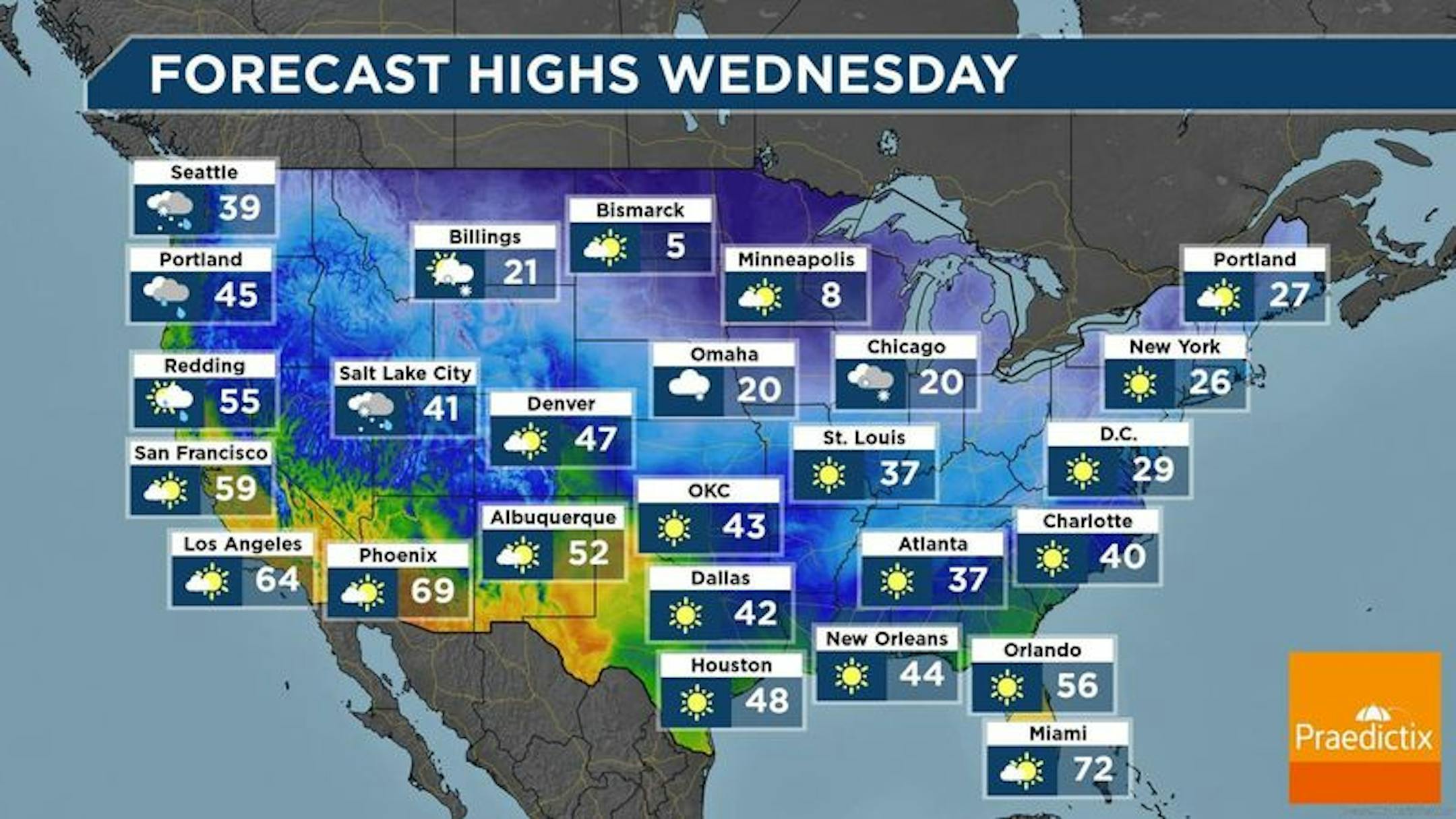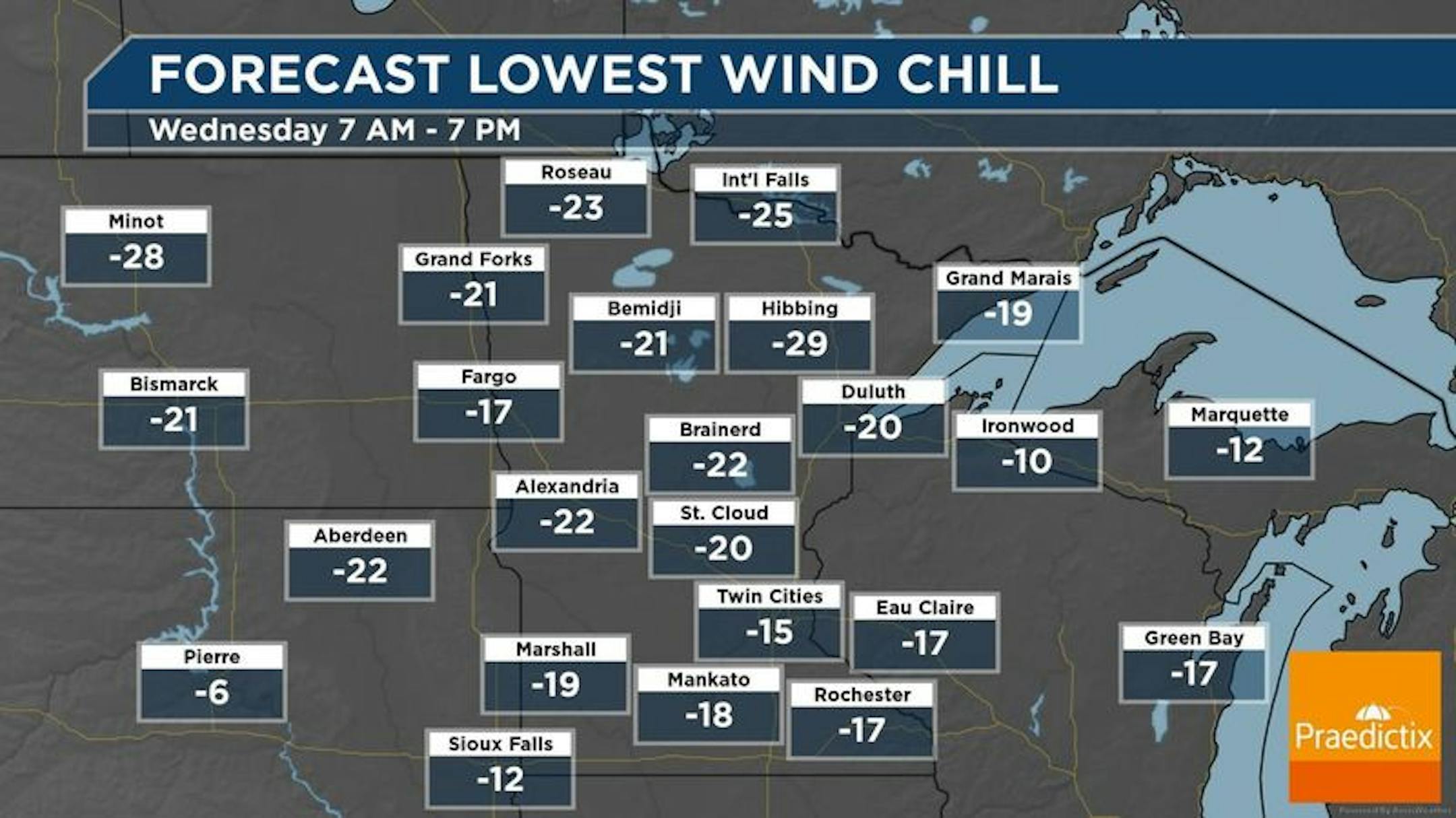 Here's the lowest wind chills expected on Wednesday. Some locations will be in the -10s to -30s across the region, which means that frost bite could occur within minutes for some. Bundle up!