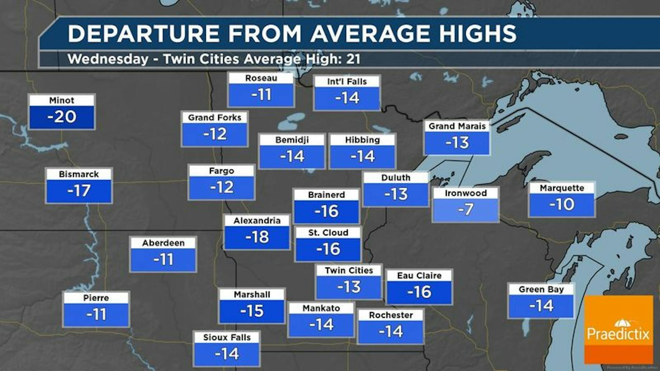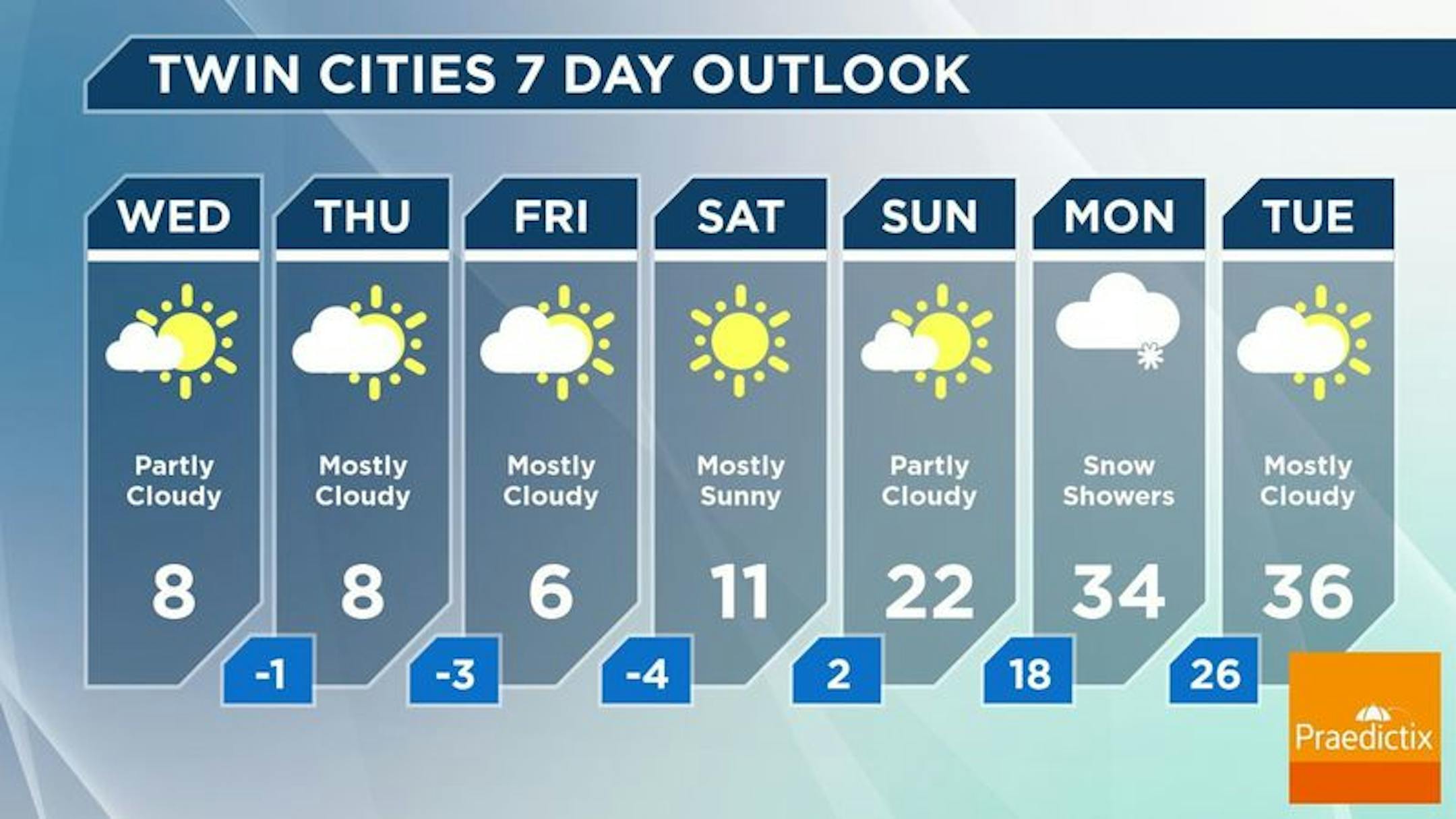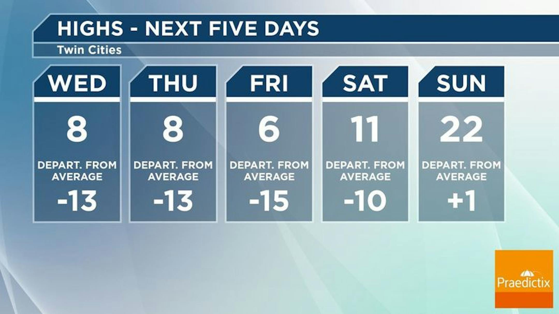 Temps in the Twin Cities over the next several days will continue to see very cold temps with readings running well below average for this time of the year. As we approach the weekend and into next week, we'll see a pretty dramatic shift toward warmer temps once again.