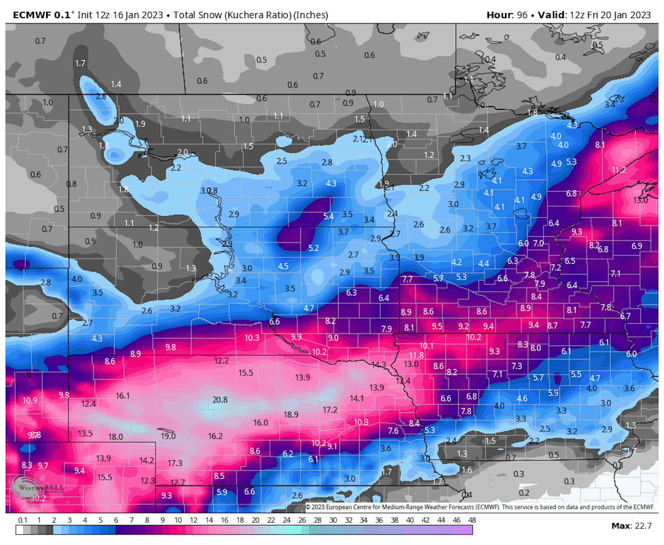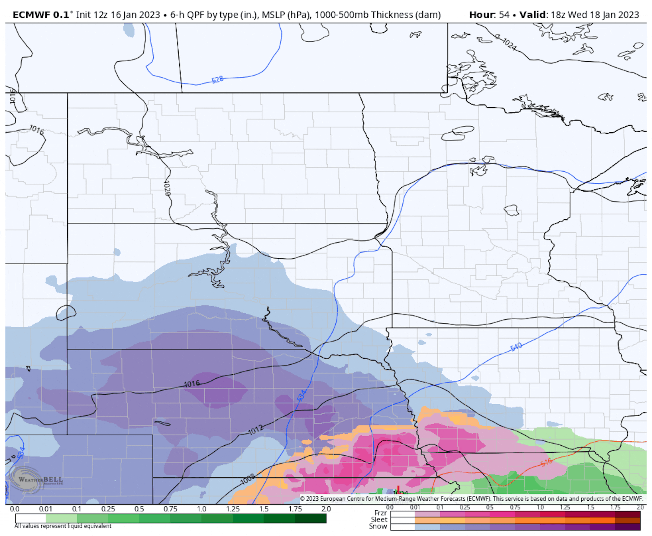 Here's the ECMWF snowfall potential, which shows a fairly decent swath of snow stretching from Nebraska into southern Minnesota. Again, there could be some plowable amounts closer to home with the best potential across southern Minnesota. Stay tuned...