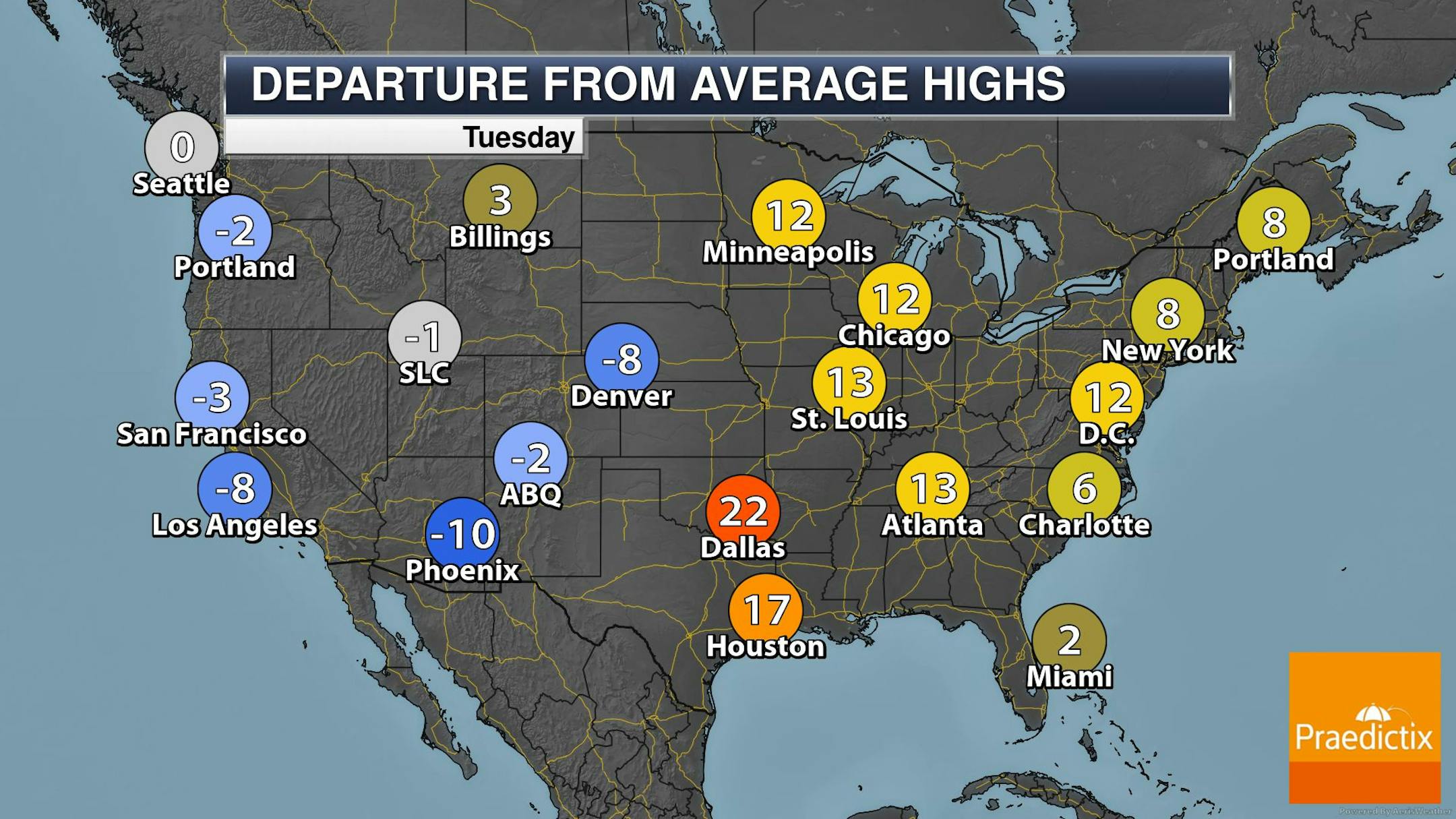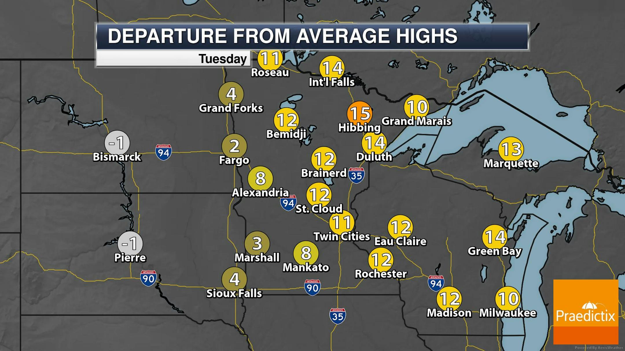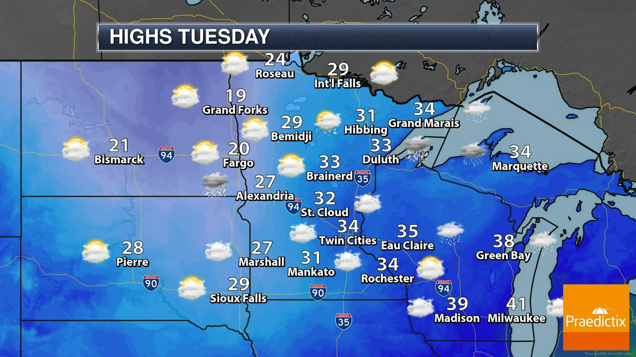 Temps across the region on Tuesday will warm into the 20s and 30s across much of the region, which will be nearly +5F to +15F above average. A few lingering snow flurries will be possible early in the day with lingering clouds and gray skies through the rest of the day. Temps will be a little colder farther north toward the Red River Valley, but nothing too significant for what is typically the coldest time of the year.