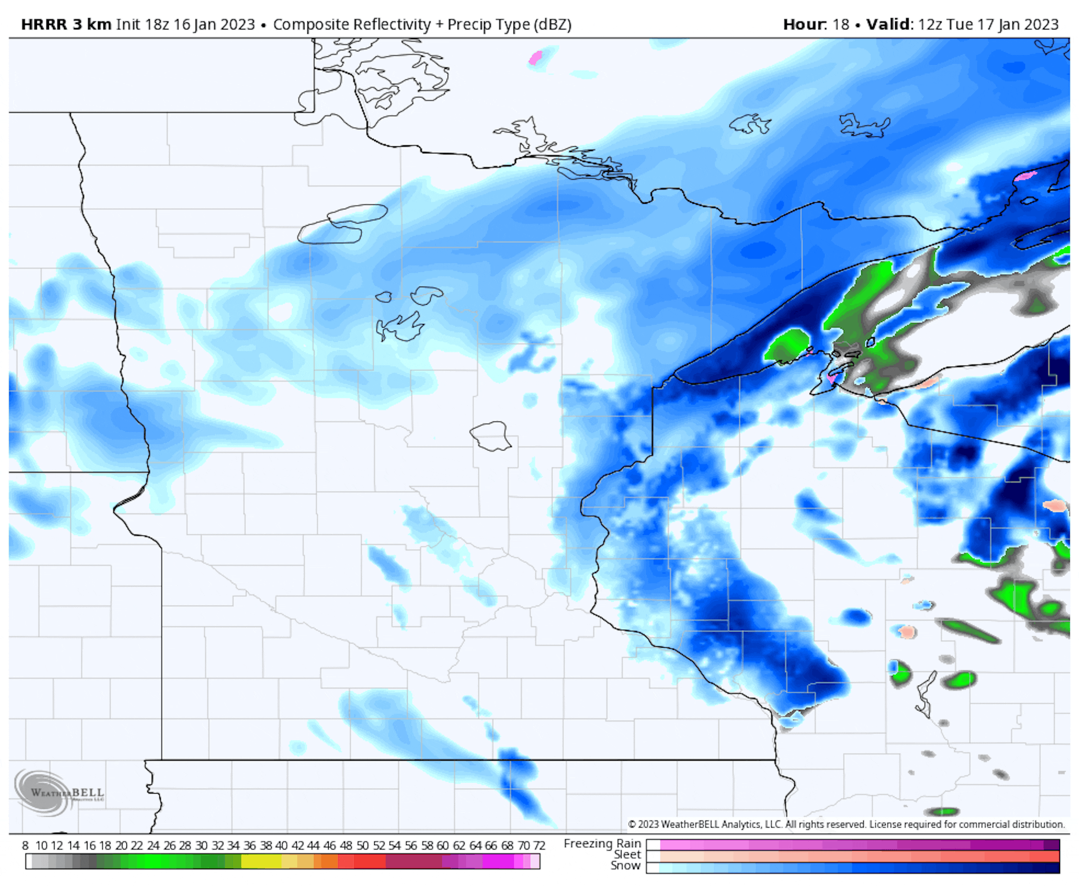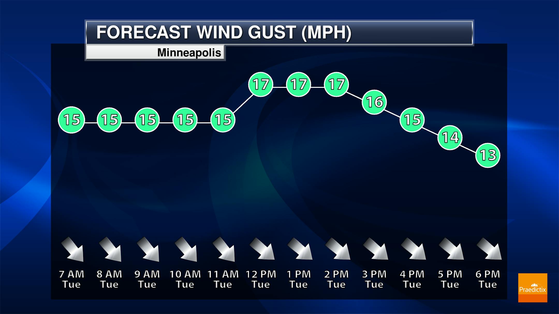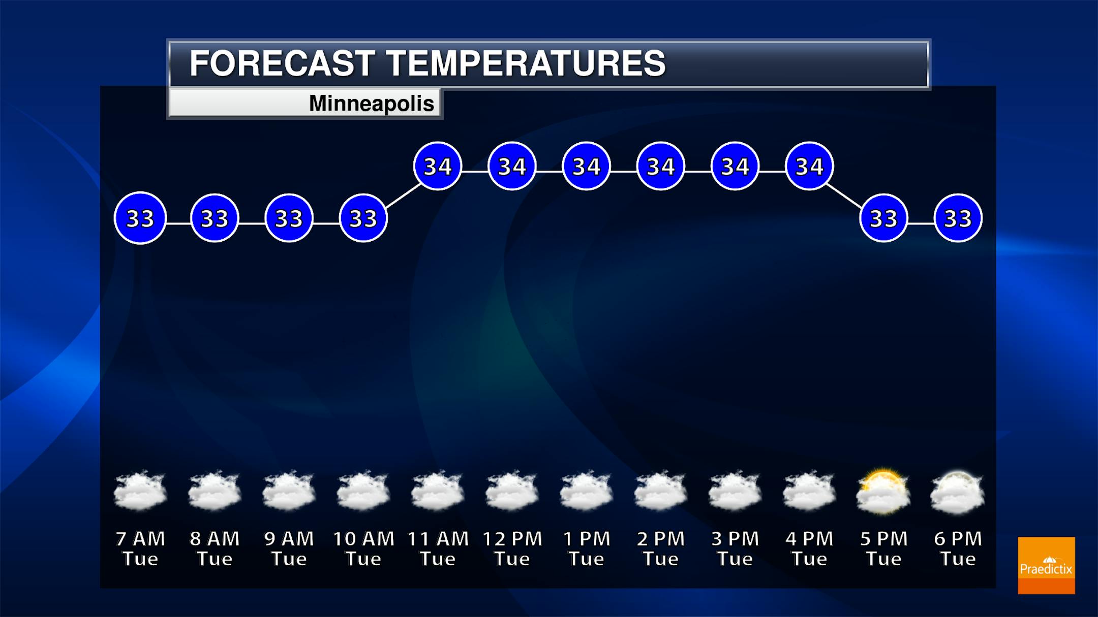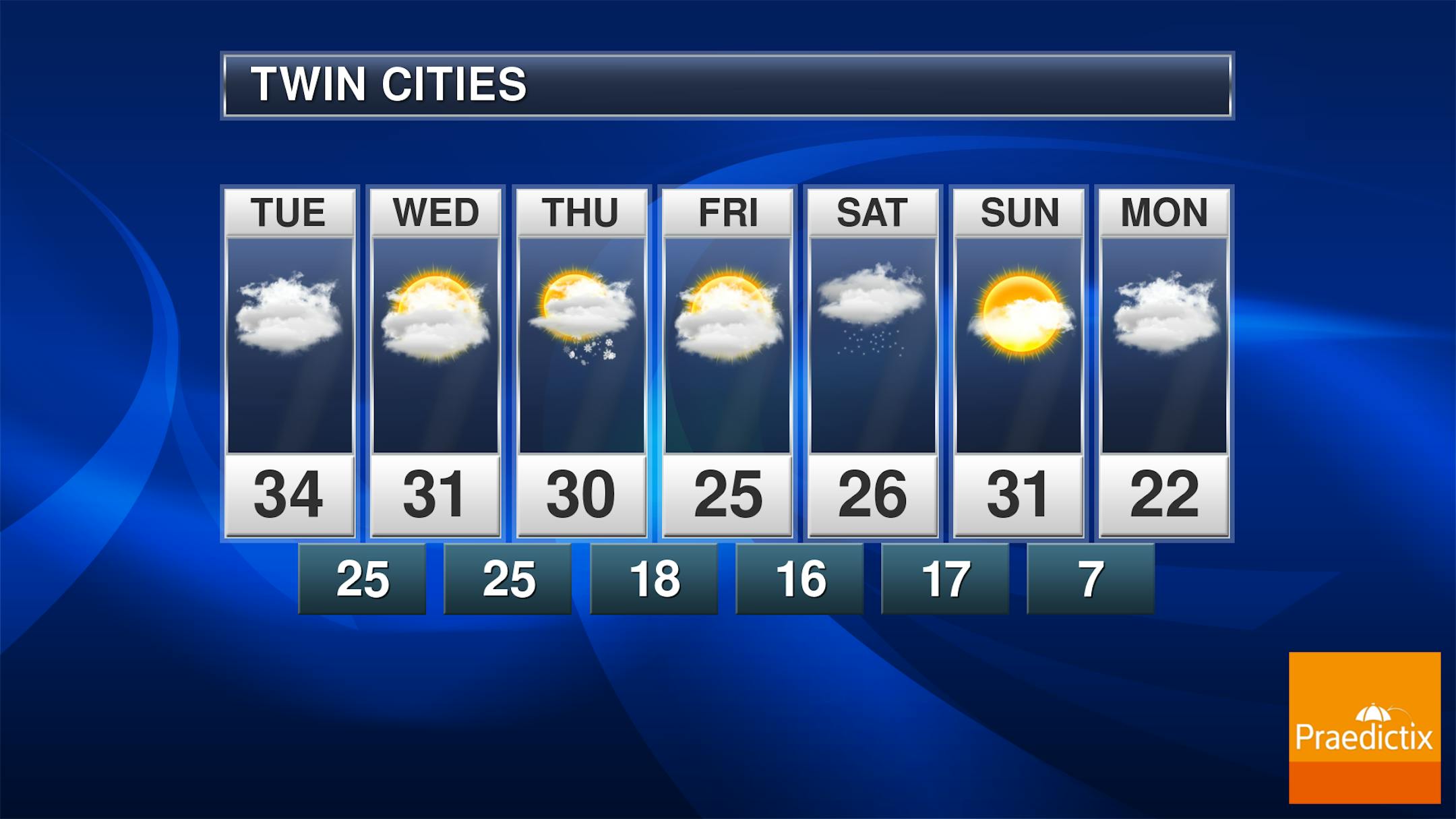 The weather outlook for the Twin Cities on Tuesday, January 17th shows very mild weather in place for Mid January with a high temp in the mid 30s. A few flurries will be possible in the morning with lingering clouds and gray skies through the rest of the day.