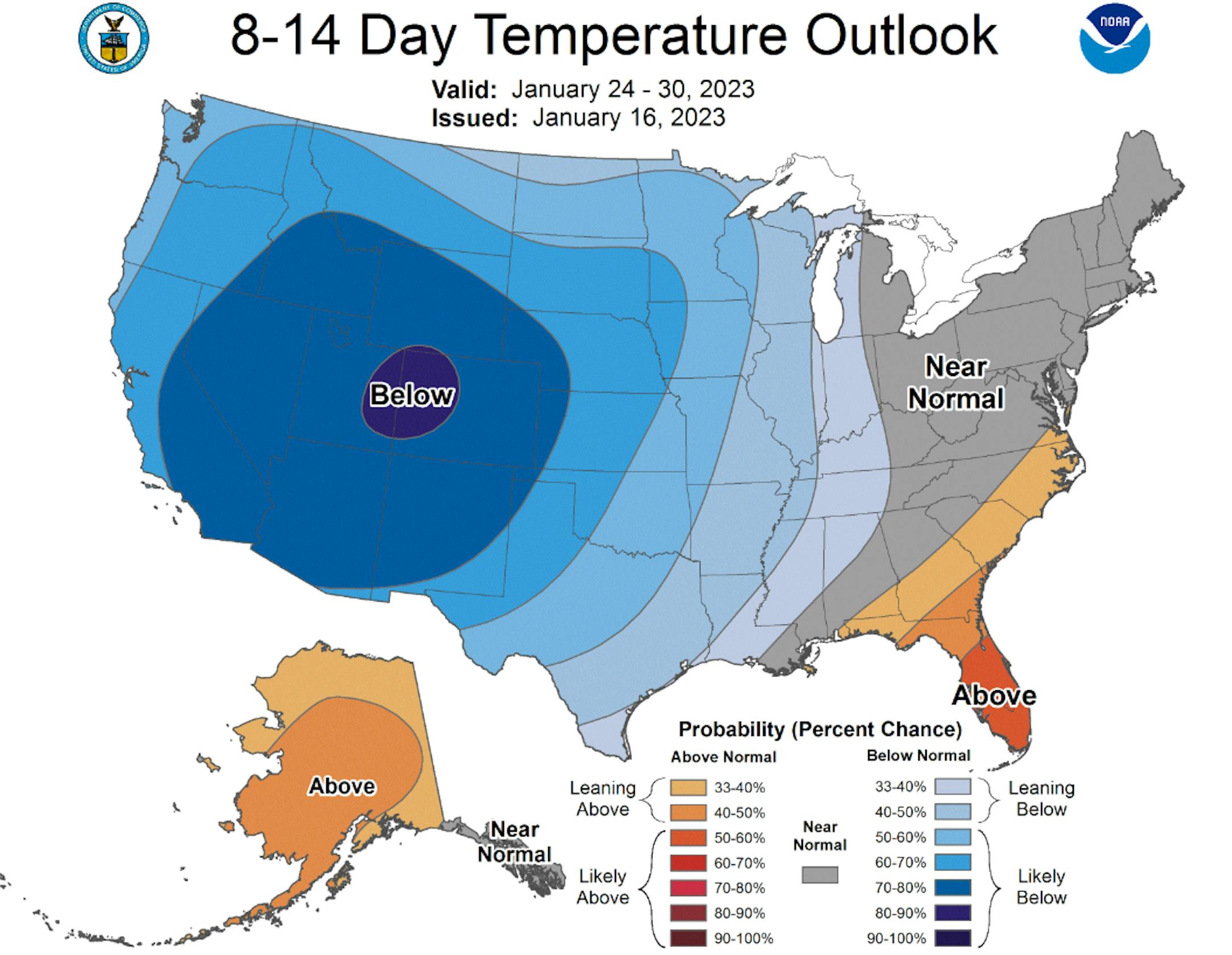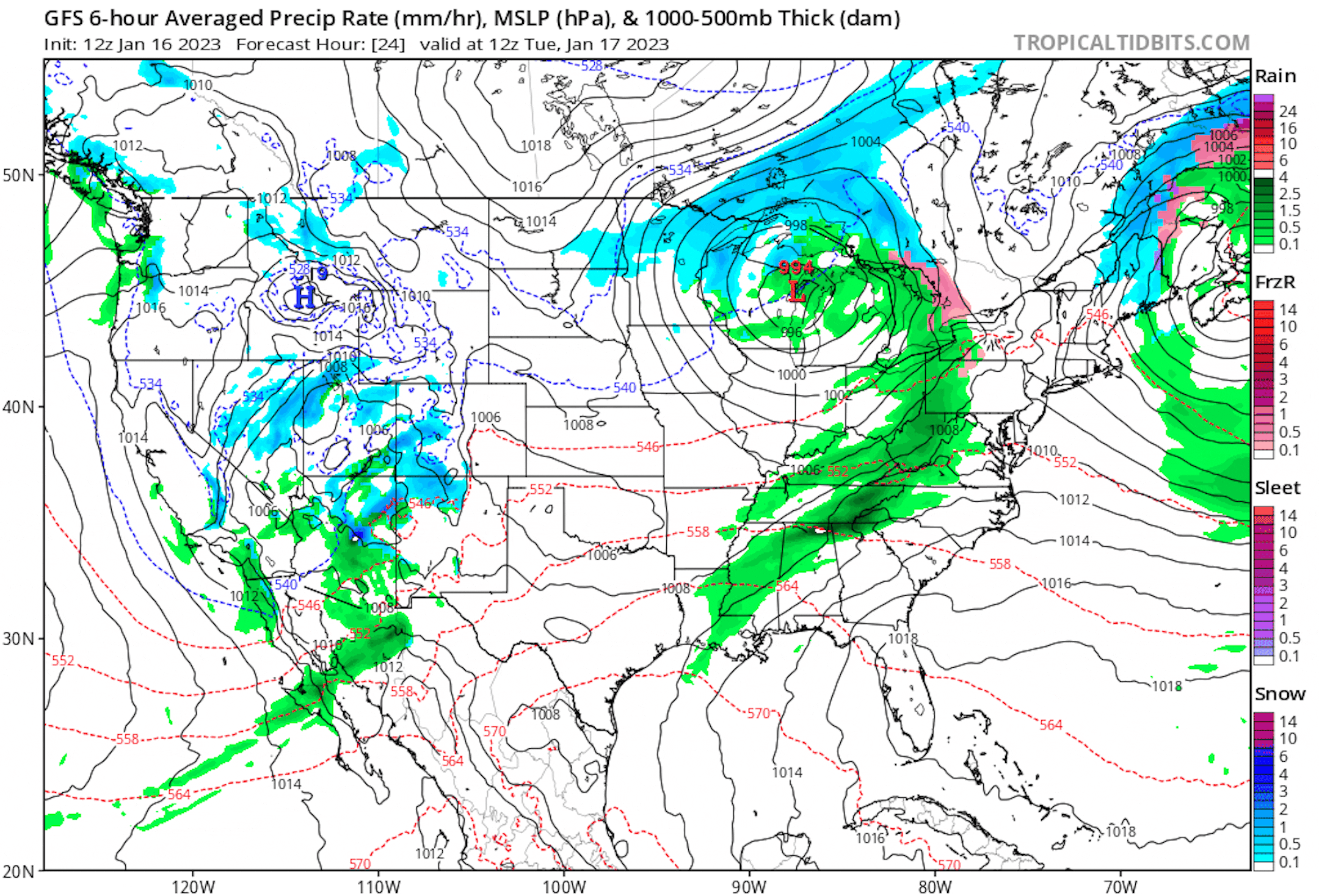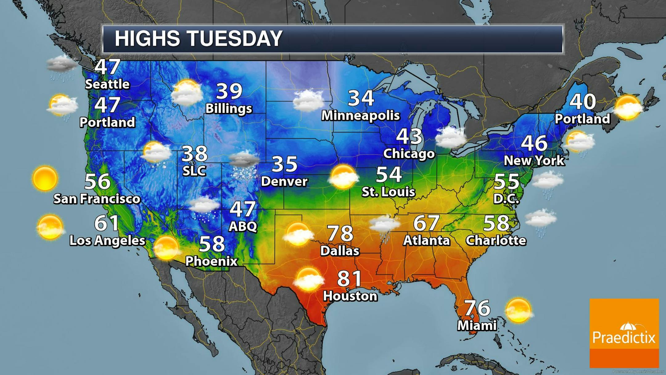 The weather outlook through the day Tuesday shows mild temperatures hovering in the low/mid 30s with mostly cloudy skies throughout the day. Northwest winds will be a bit breezy at time with some 15mph to 20mph.