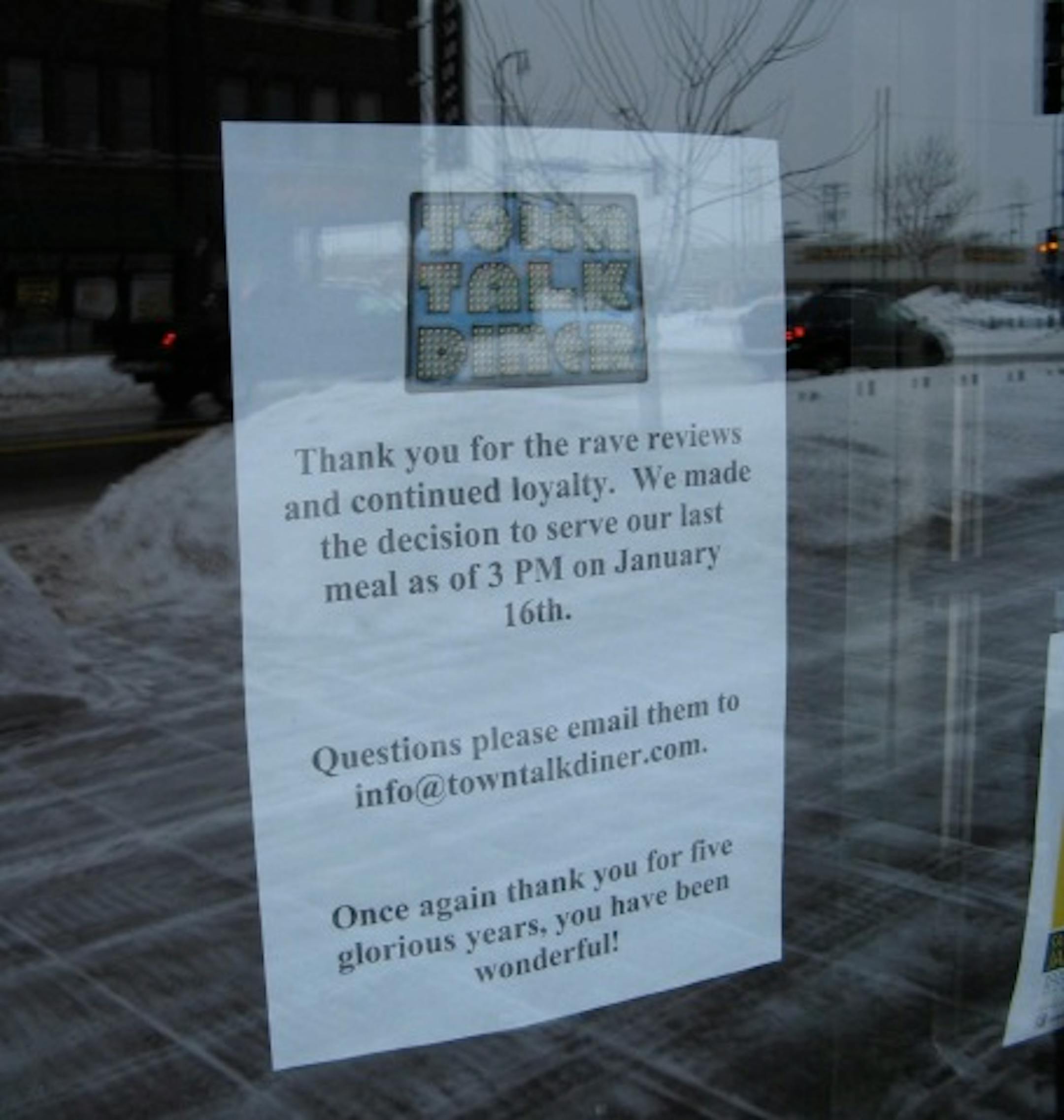 Bummer: Lake Street's jazziest sign has gone dark. The Town Talk Diner, which re-opened to great acclaim at a "finer diner" in 2006, abruptly closed Sunday afternoon. A sign on the door reads, "Thank you for the rave reviews and continued loyalty. We made the decision to serve our last meal as of 3 p.m. on January 16th. Once again, thank you for five glorious years, you have been wonderful."