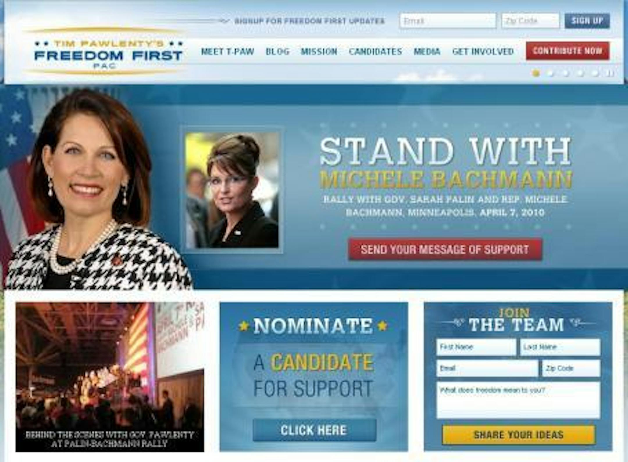 Not only did Gov. Tim Pawlenty speak at the event, he transformed the front of his Freedom First Web site into a Bachmann campaign pitch and purchased the domain name "bachmannrally.com" just for the occasion.