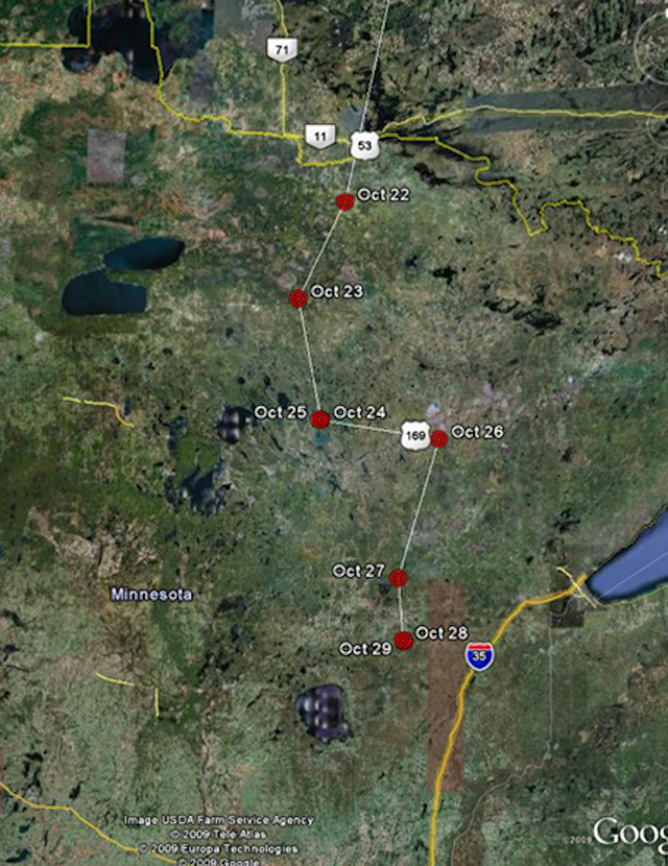 Oct 28 – 29, 2009 –Eagle 42 spent the evenings of both days in eastern Aitken Co. 5 miles east of Rice Lake National Wildlife Refuge. Moved about .5 miles during the day of the 29th and Roosted on the edge of a woodlot. Roosted 18 mi. south from his location on the 27th.
