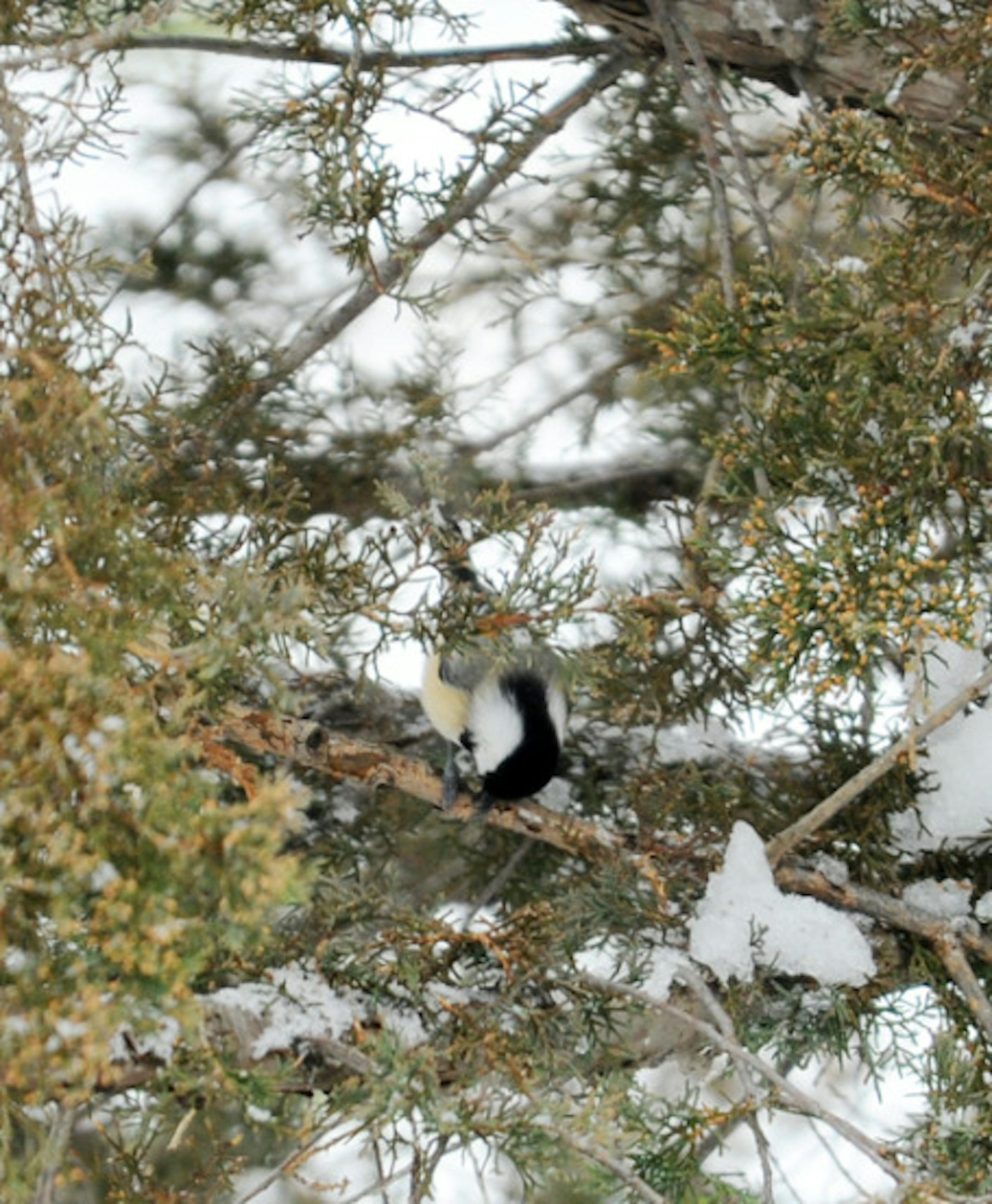 We've finally settled on a permanent location for the bird feeders in our backyard. This after eight years of moving here and there. Our concern was the seed-debris mess left each spring as sunflower-seed hulls accumulated on the ground (grass) over winter. We're now in a part of the yard where longer grass and less concern for appearance exist. The location meets all basic requirements: We can easily see the feeders from convenient windows in the house; we can easily fill the feeders; squirrels can't jump from any tree to the feeders; and the birds accept the location. I think we've also added an important criteria: there now is a nearby coniferous tree – a white cedar – that offers the birds shelter when they're approaching the feeders or when they're eating. Shelter in this situation is protection from predators, an important consideration if you're a bird. The cardinals that feed with us usually land on the cedar before proceeding to the sunflower seeds they seek. Chickadees almost always take seeds from the feeder to another location to eat. They want to perch on a surface that allows them to hold the seed with their feet while they hack it open. The cedar is perfect for that. It's 10 feet from the feeders, a flight that costs little energy, and it keeps them hidden while they eat. Other species eat at the feeders, but use the cedar as cover coming in and when alarm scatters them from the feeders for a moment or two. You're likely to attract more birds to your feeders if cover of some kind is nearby. Almost any tree or large shrub will work, although conifers likely are best because of their year-round foliage. The photo shows a Black-capped Chickadee working on a seed deep inside that cedar tree.