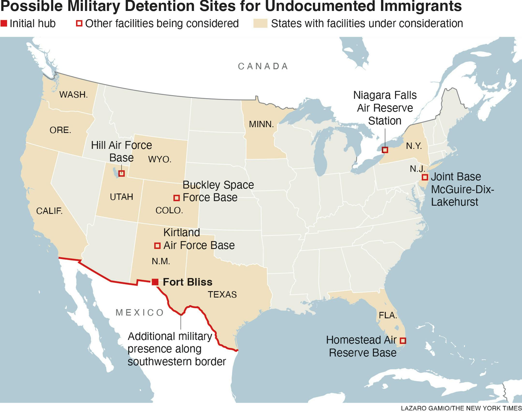 But the Trump administration plan would expand that practice by establishing a nationwide network of military detention facilities for immigrants who are subject to deportation. The proposal would mark a major escalation in the militarization of immigration enforcement after Trump made clear when he came into office that he wanted to rely even more on the Pentagon to curtail immigration.