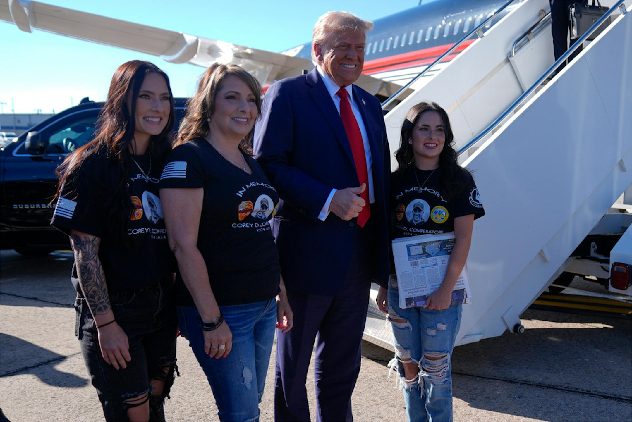 At the beginning of the rally, Trump asked for a moment of silence to honor firefighter Corey Comperatore, who died as he shielded family members from gunfire in July. Classical singer Christopher Macchio sang ''Ave Maria'' after a bell rung at the same time that gunfire began on July 13. Several of Comperatore's family members were in attendance, including his widow, Helen, who stood during Trump's remarks next to the former president's daughter-in-law, Lara Trump.