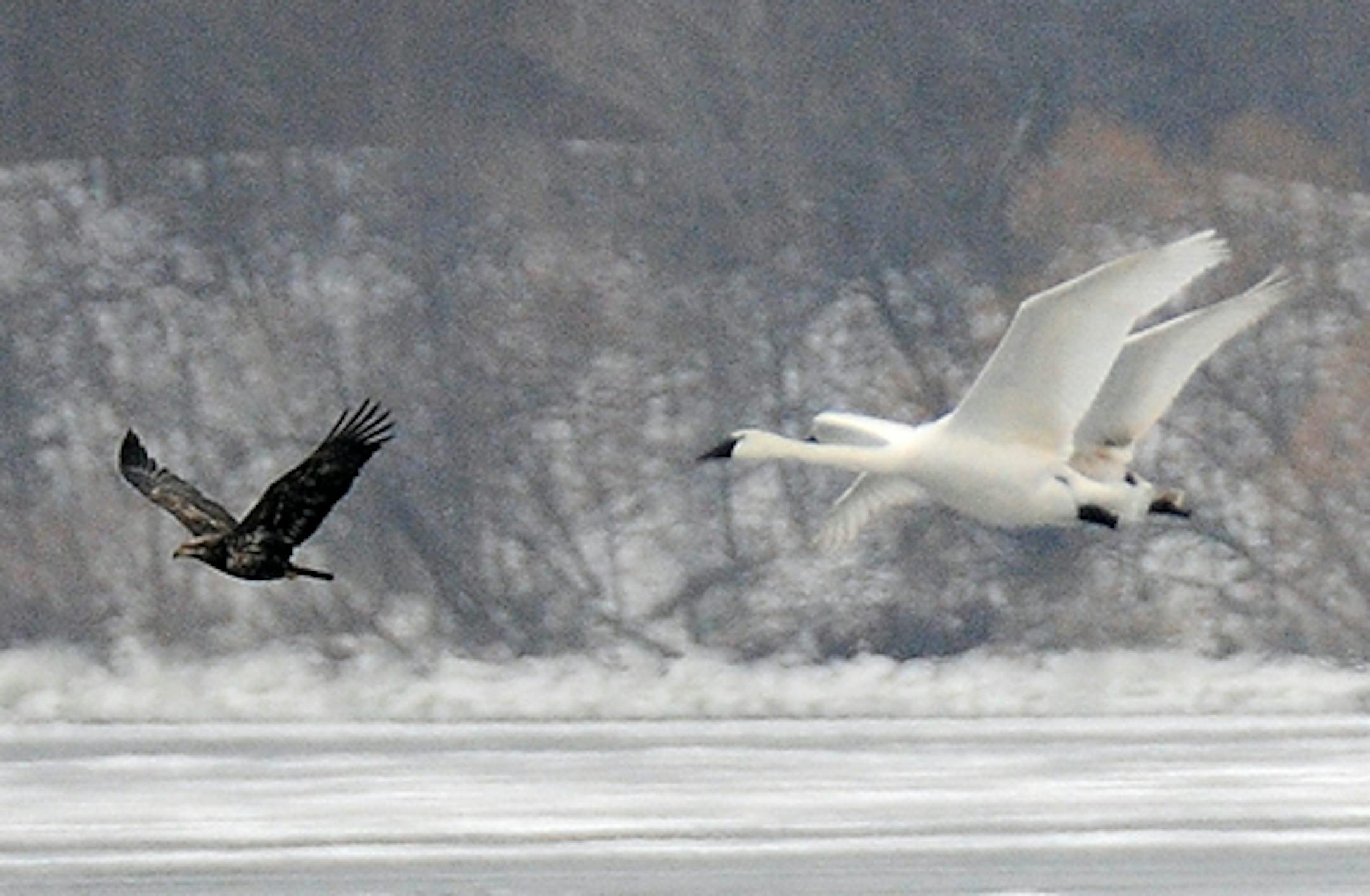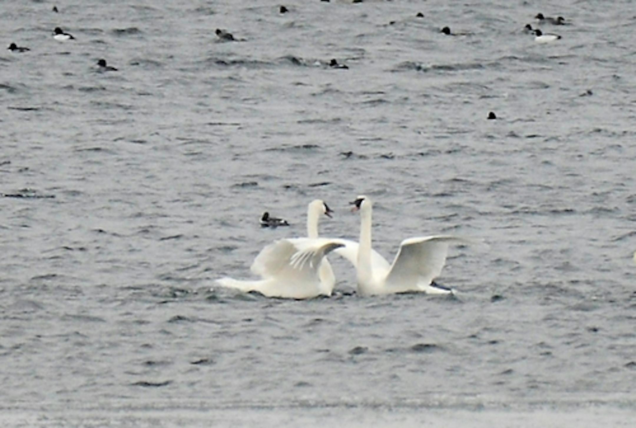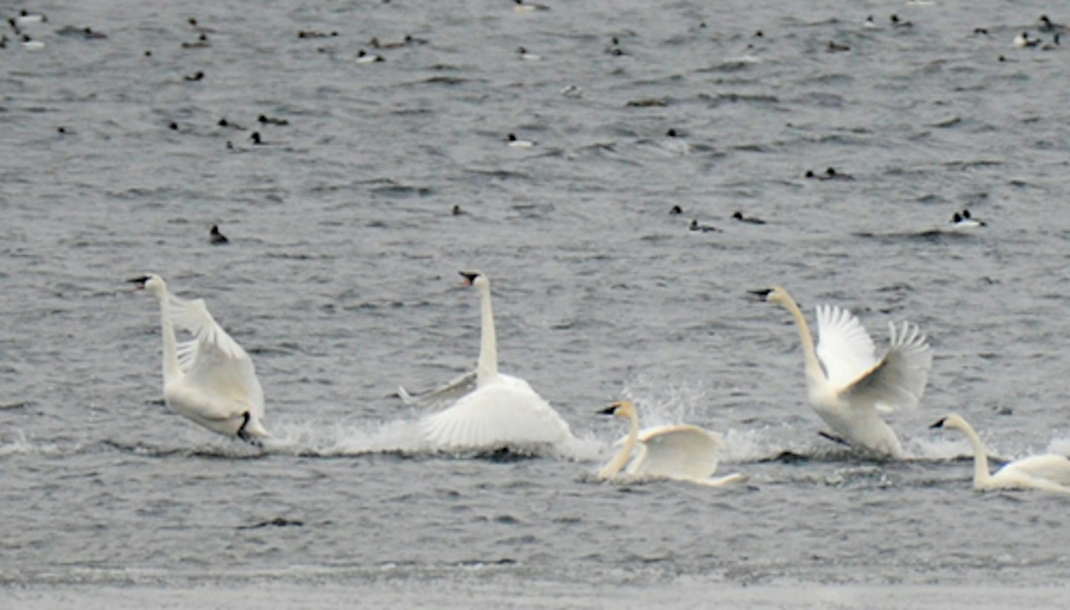 Trumpeter Swans were sharing open Lake Minnetonka water with the thousands of Common Mergansers (and a few Bald Eagles) on one of the lake's last pieces of open water. Three swans on the water were joined by seven others one day, an arrival greeting with loud trumpeting and posturing that resembled courtship. Both sets of these very social birds began calling with the arrivals were a couple of hundred yards away. Some of the fly-ins landed in an erect posture, to be greeted with similar display by swans on the scene. The trumpeting continued for a minute or so, then settled into a murmur that gently faded. Swans can be seen during serious winter weather on the Mississippi River near Monticello.