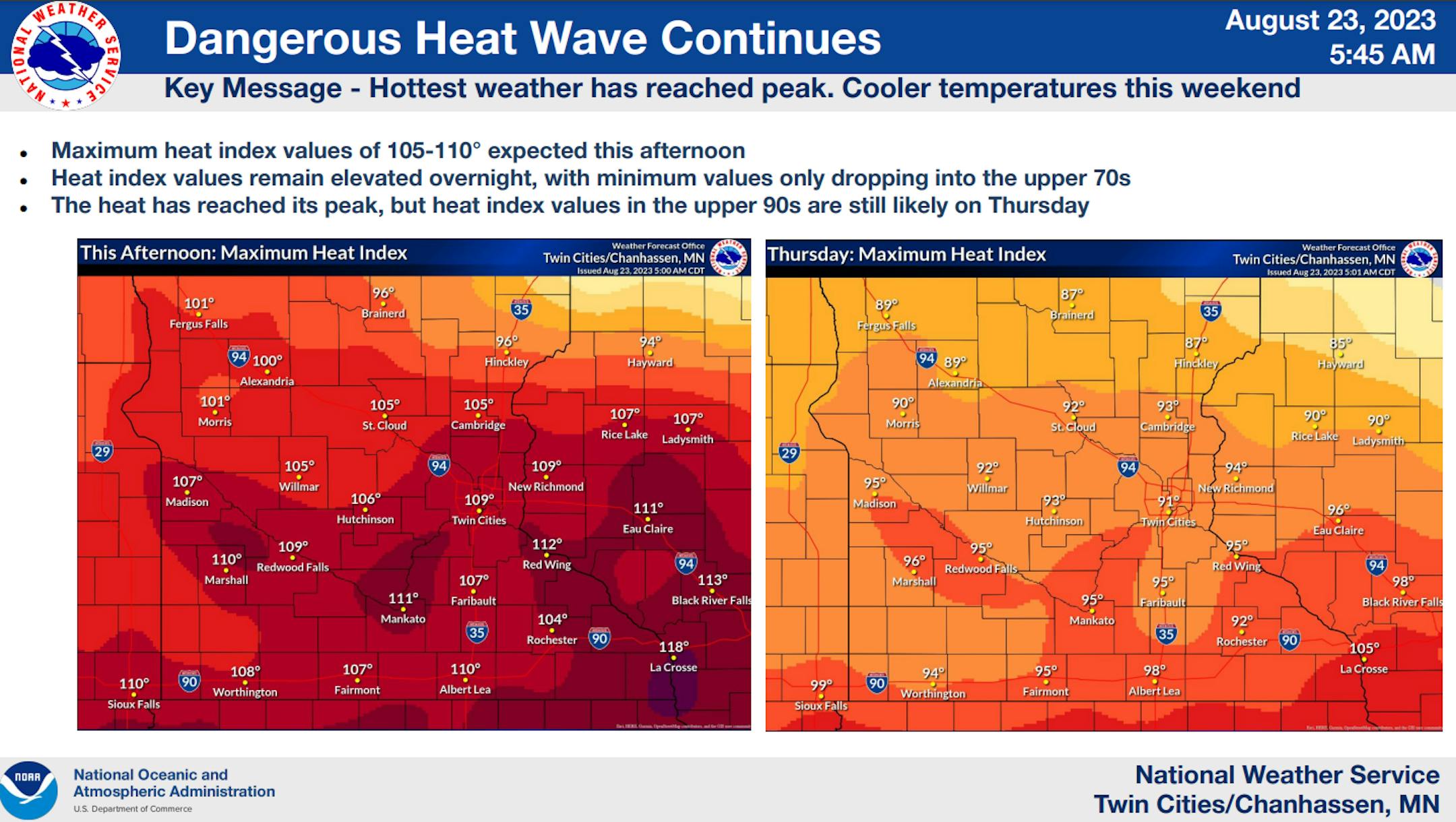 ADDITIONAL DETAILS...Multiple days of excessive heat may lower one`s tolerance of it over time. Overnight temperatures will only drop into the 70s, but possibly remaining in the lower 80s in the metro and southern Minnesota. The extreme heat may also lead to buckling roads.