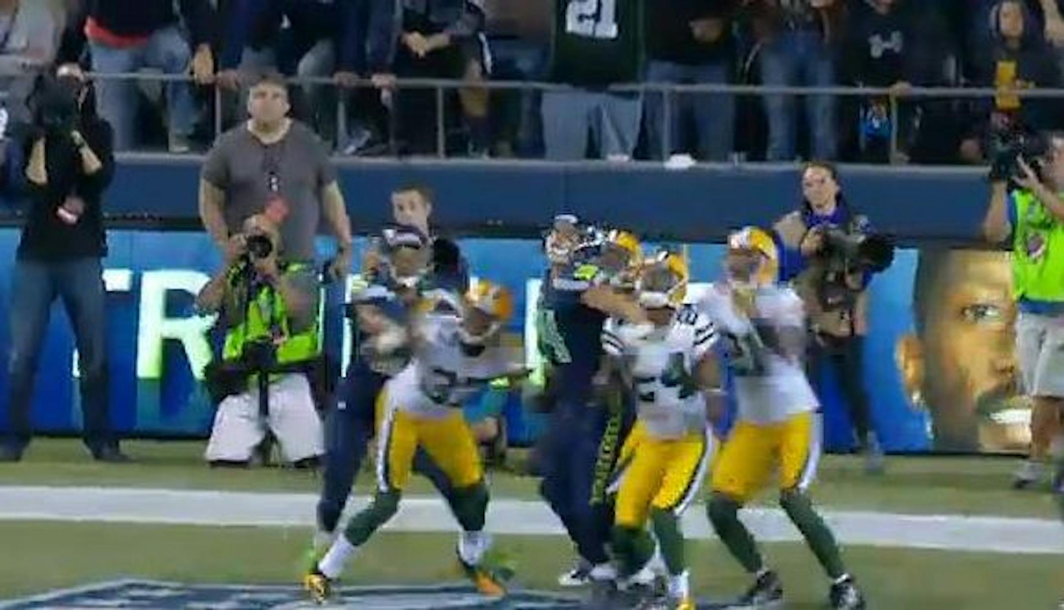 1. Underrated aspect of the whole play: Golden Tate, who would be ruled to have caught the TD, completely shoving a Packers defender just before the ball arrived. Here's a fun screen grab below.